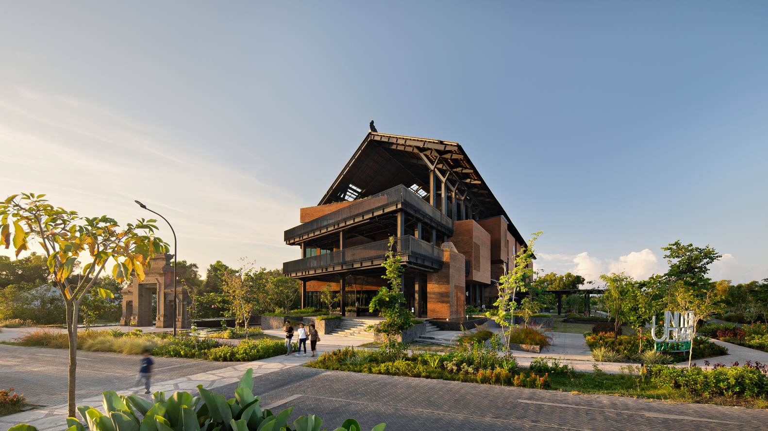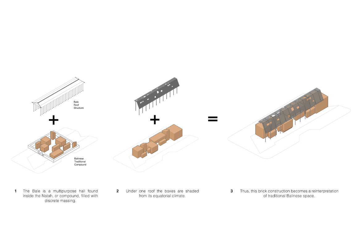 巴莱 “是巴厘岛传统的茅草屋顶结构,通常被解释为供人们聚集的多功能厅。巴莱采用屋顶形式,象征性地指向高山和天空。威利斯-库苏玛建筑事务所(Willis Kusuma Architects)采用了这一传统形式,将其放大为一个上层建筑,创造出一个巨大的屋顶,将所有项目都遮盖在其下。