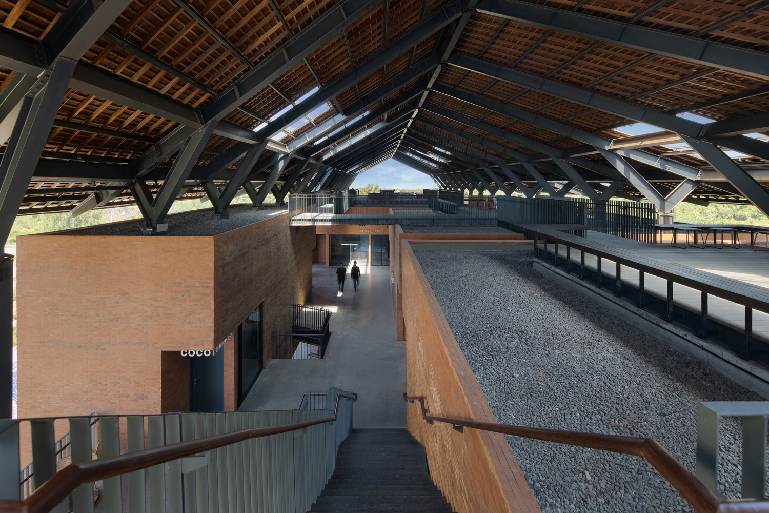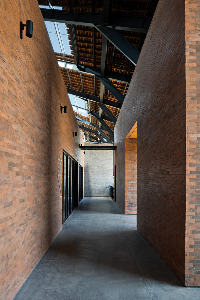 底层是商业功能区和一个小型博物馆。二楼和三楼设有联合办公空间和教室,三楼设有私人办公空间、多功能厅和媒体室。室内和室外露天剧场营造了非正式的聚会空间。在巨大的屋顶下最靠近的是露台,露台上设有座位区,可以欣赏岛上的美景。封闭的砖砌体量与同一屋顶下的所有露天内部空间之间的互动创造了一种独特的空间体验,通过视觉和听觉上的联系,让建筑的使用者动态地参与其中。