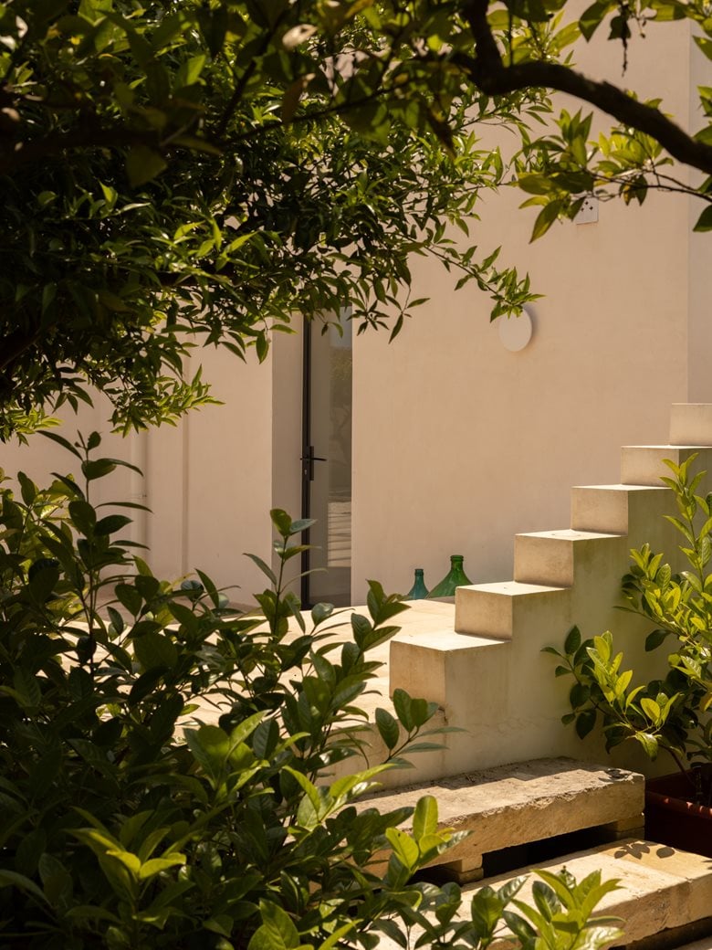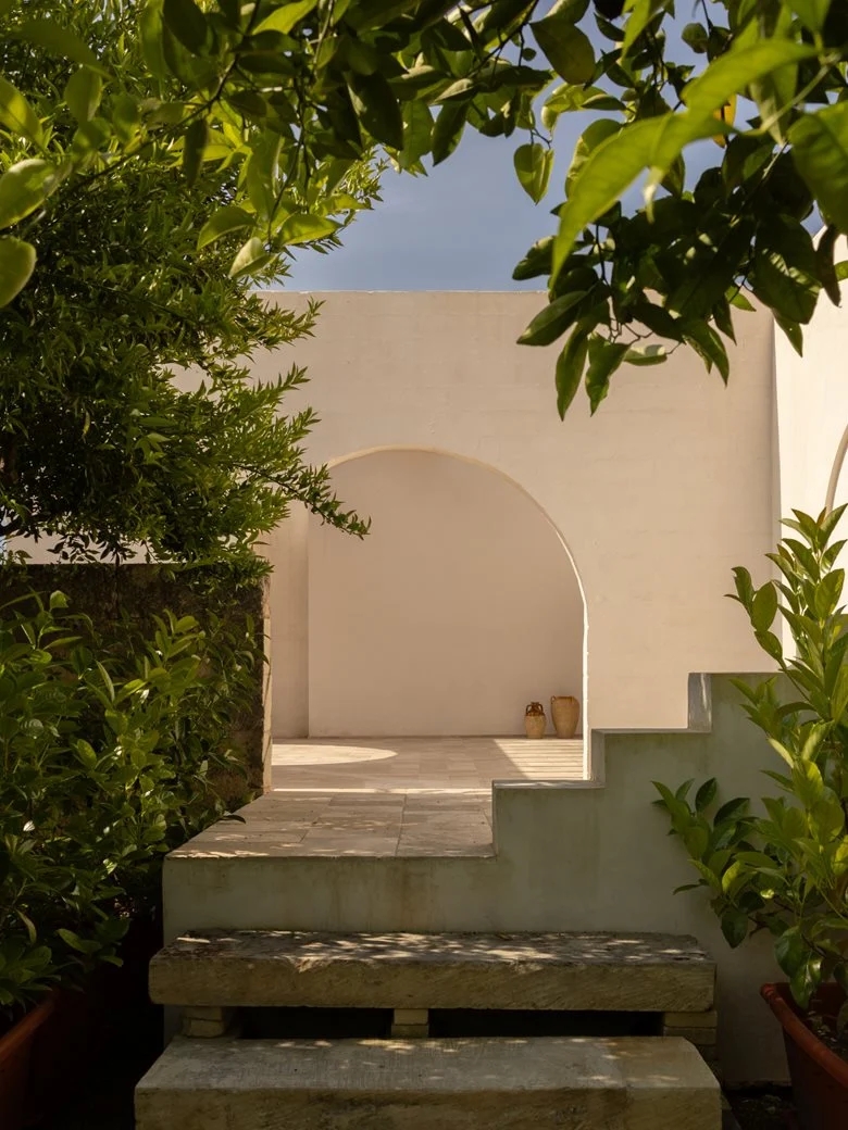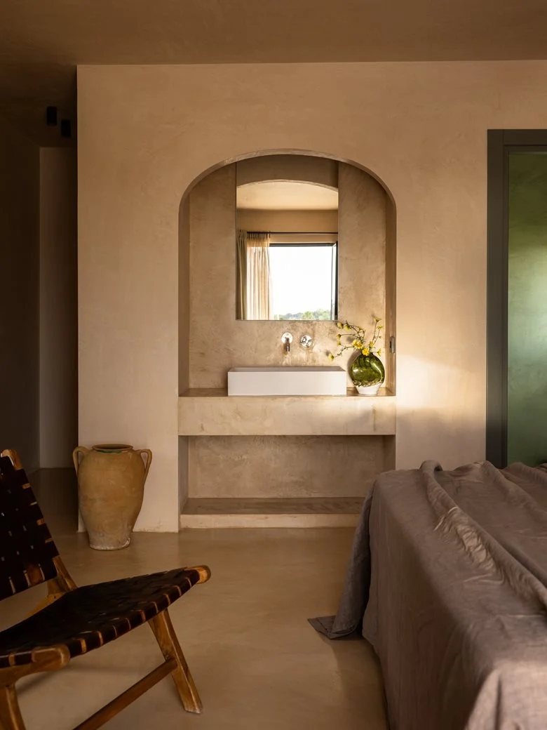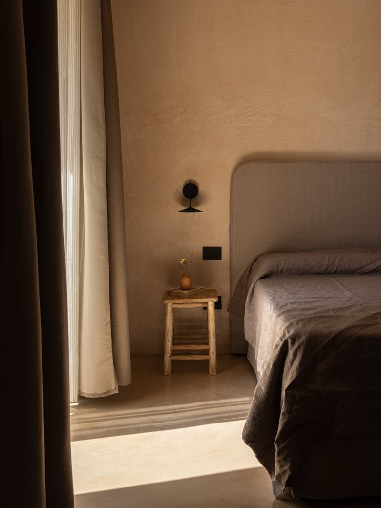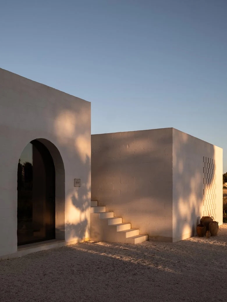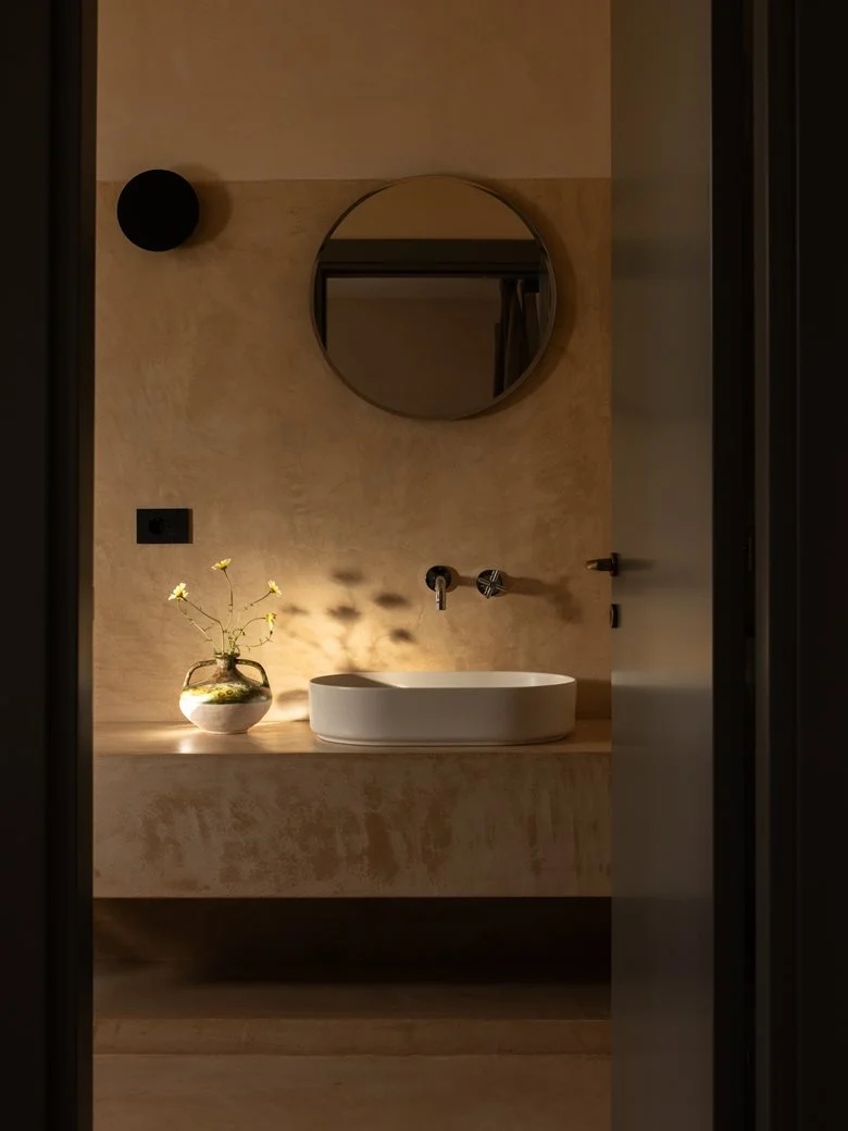 主庭院:被打造为一处露天小广场,对称式拱门将空间节奏清晰划分,向天空完全敞开。次庭院:氛围更为私密,一面带格栅的隔墙将建筑的视觉边界向外延伸。庭院内设有一座石砌楼梯 —— 这一地中海建筑中的经典元素,兼具实用功能与雕塑般的视觉效果。项目功能还包含两间客房,其材料与色彩设计保持了整体一致性:米色石灰灰泥墙面、沙质色调,以及采用科乔佩斯托饰面的浴室。这些空间将餐厅的触觉质感与氛围体验,延伸至住宿功能之中。