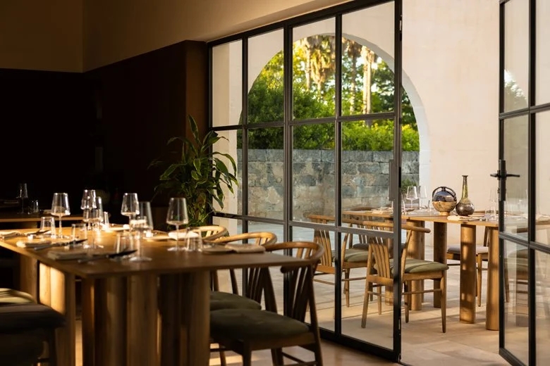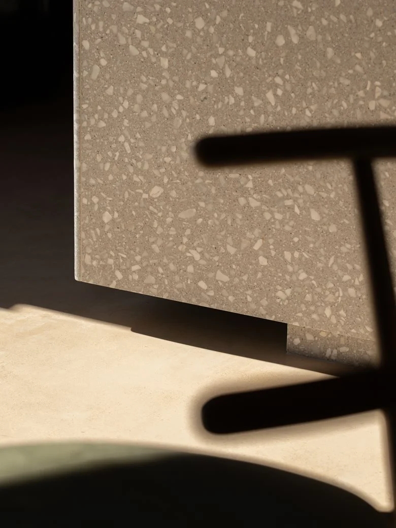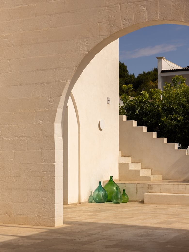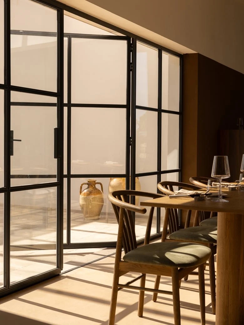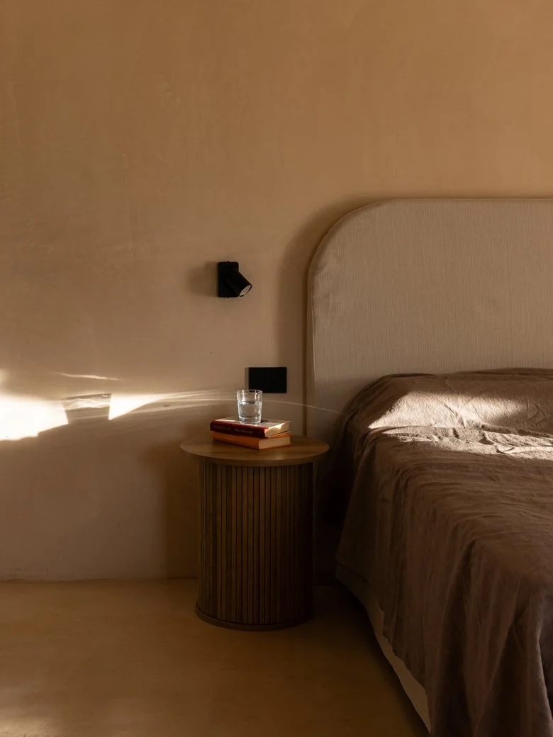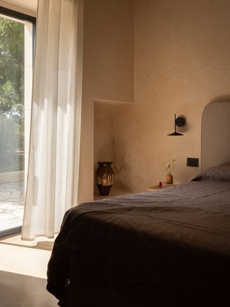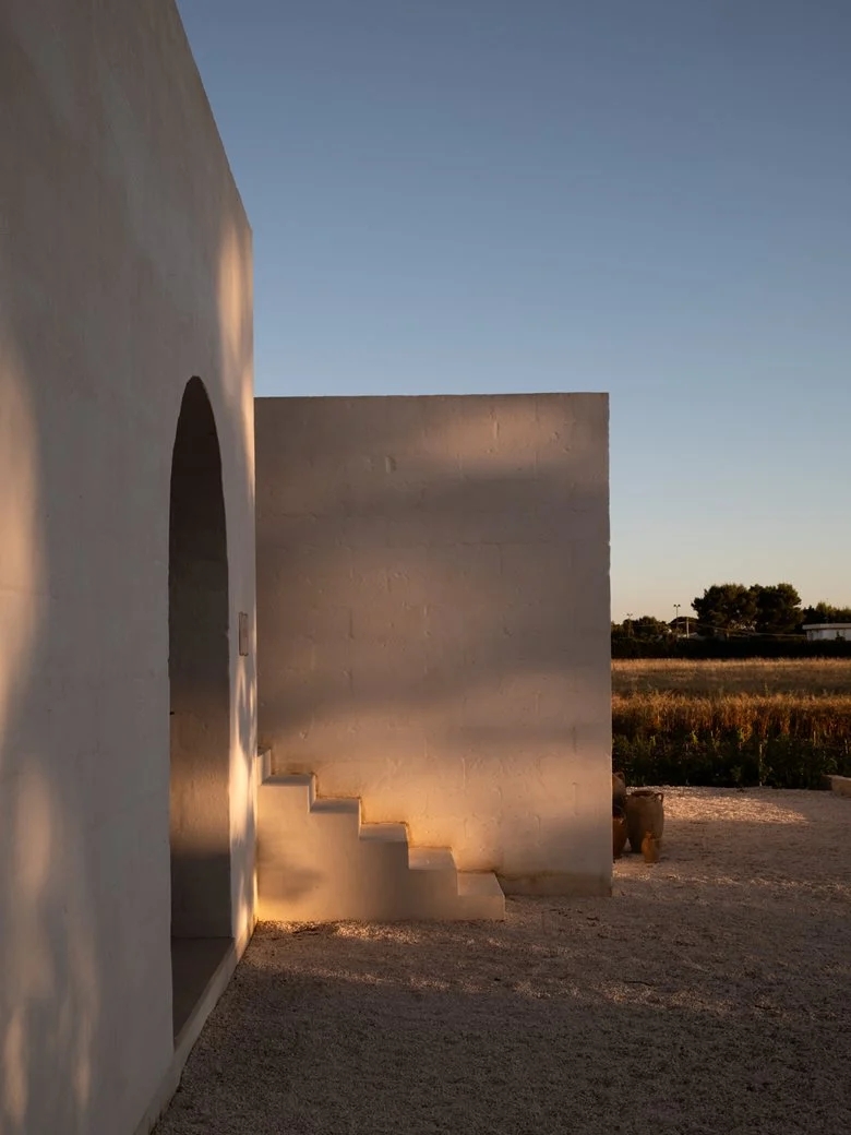 主庭院:被打造为一处露天小广场,对称式拱门将空间节奏清晰划分,向天空完全敞开。次庭院:氛围更为私密,一面带格栅的隔墙将建筑的视觉边界向外延伸。庭院内设有一座石砌楼梯 —— 这一地中海建筑中的经典元素,兼具实用功能与雕塑般的视觉效果。项目功能还包含两间客房,其材料与色彩设计保持了整体一致性:米色石灰灰泥墙面、沙质色调,以及采用科乔佩斯托饰面的浴室。这些空间将餐厅的触觉质感与氛围体验,延伸至住宿功能之中。