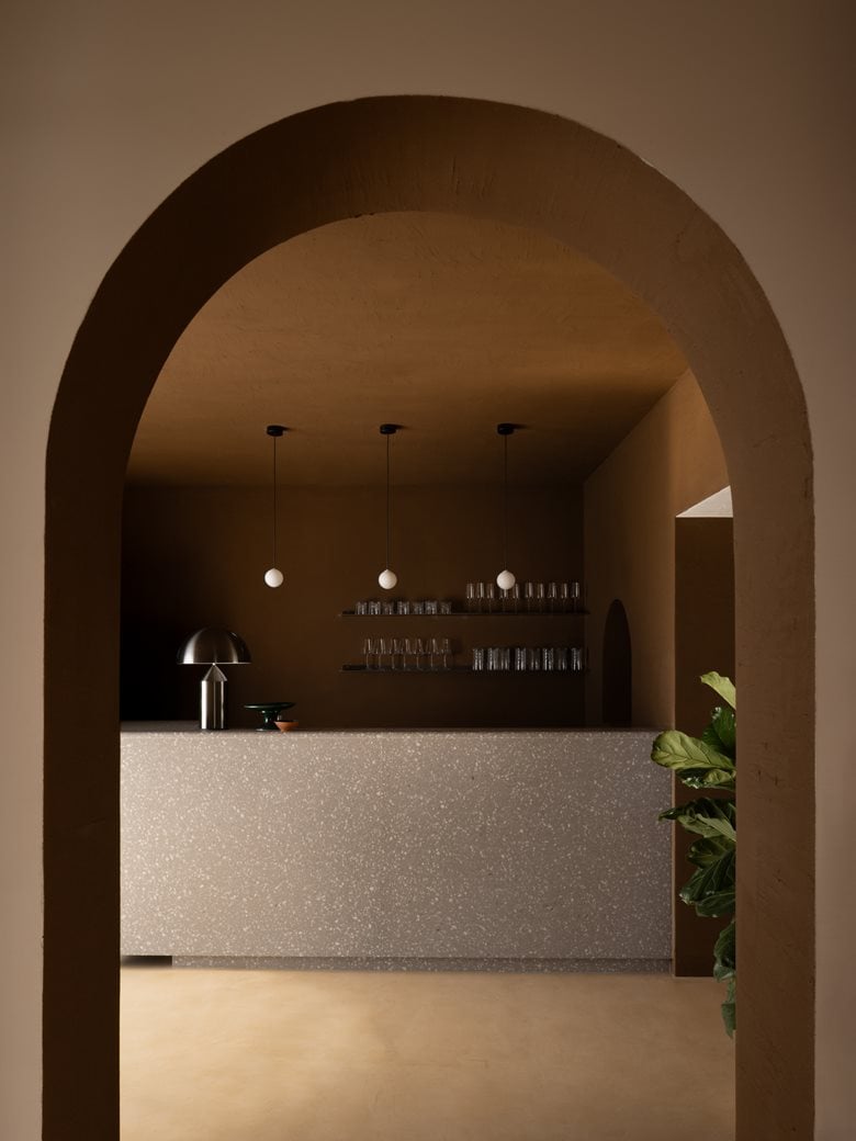 入口空间由一座整体式黏土接待台界定,台面上设有雕塑感十足的黑色水磨石柜台。从这里进入主用餐区:这是一个呈线性排布的 “中殿式” 空间,地面铺设 “科乔佩斯托”(cocciopesto,注:古罗马传统建筑材料,由碎陶片、石灰与水混合制成,具有良好的防水性与耐久性),连续的黏土墙面向上延伸,直至与窗楣相接。从结构视觉上看,仿佛是厚重的黏土墙体支撑着轻盈的白色上层建筑体量。
