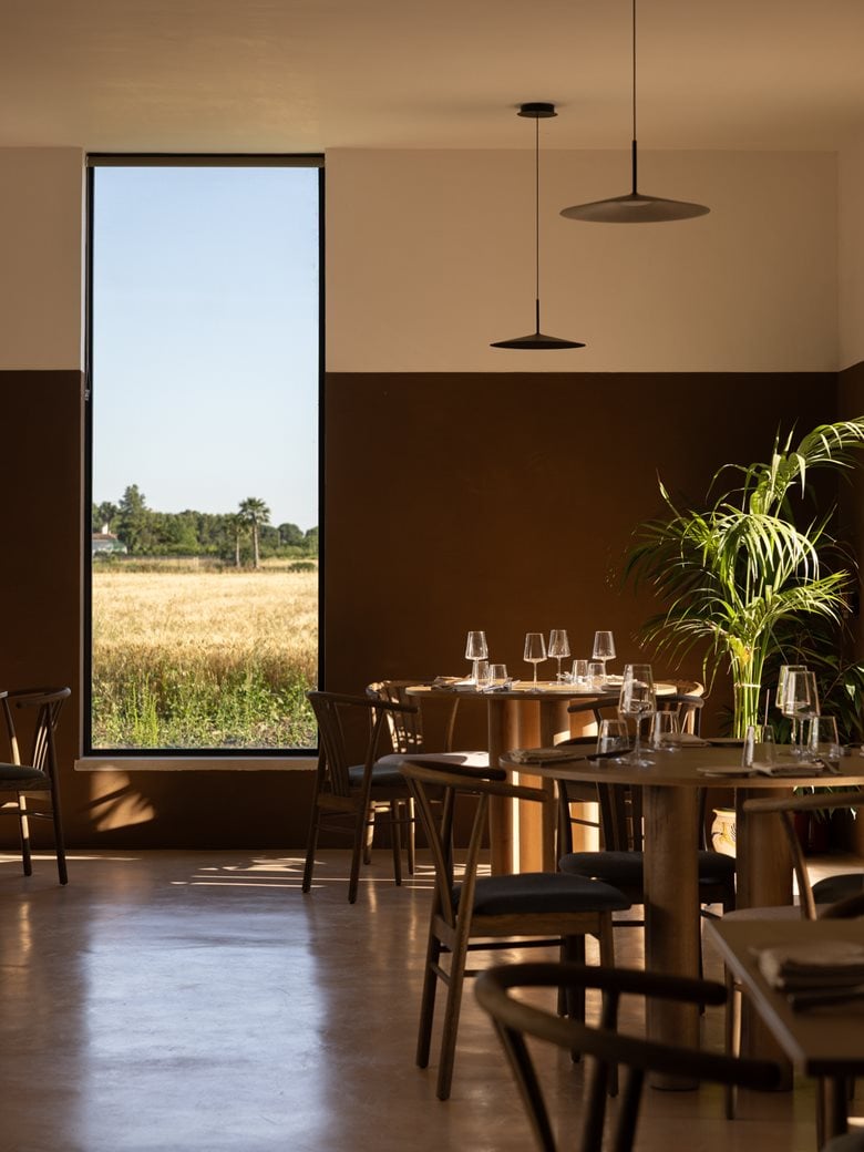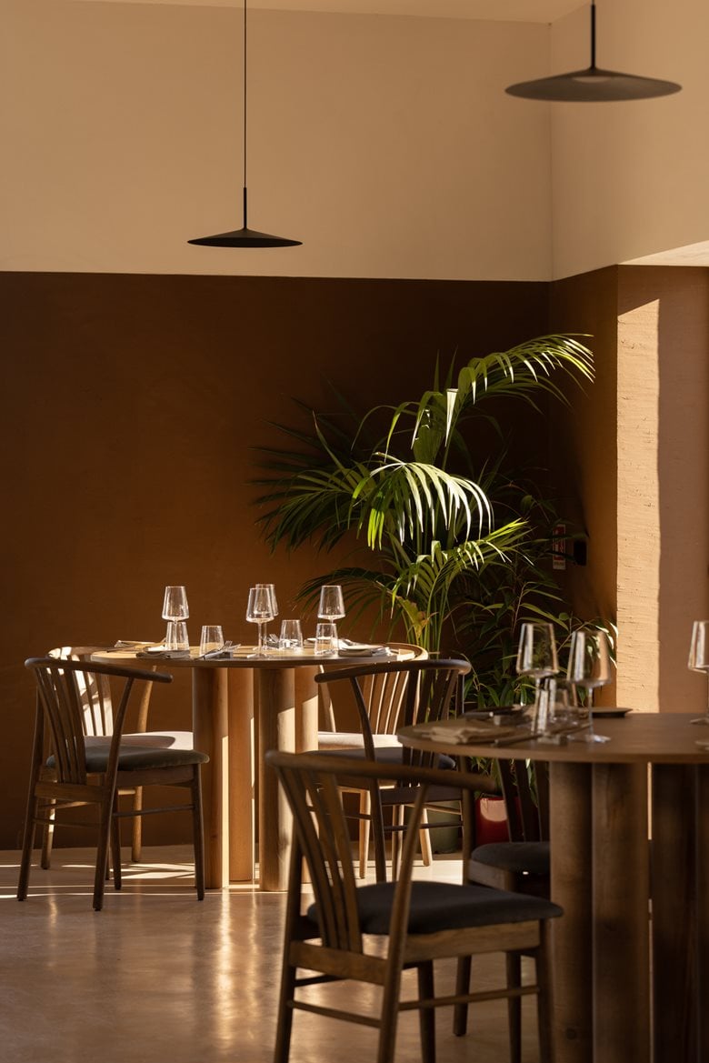 从外观来看,餐厅呈现为一个简洁的白色体块,由简约几何形态与精心规划的开窗定义。建筑表面采用石灰基灰泥与石材处理,营造出超越时间的视觉感受,光线在此清晰地塑造出建筑体量的轮廓。进入室内,物质材料的运用成为项目的核心元素:墙面采用马特奥・布里奥尼(Matteo Brioni)品牌的天然黏土灰泥饰面,呈现出质朴柔和的大地色调。这一选择绝非单纯的美学考量 —— 它与库特罗菲亚诺地区建立起直接联结,这里自古便以采石场与陶瓷窑炉闻名。因此,黏土既是文化符号的载体,也是实际建造材料,共同塑造了餐厅的空间辨识度。