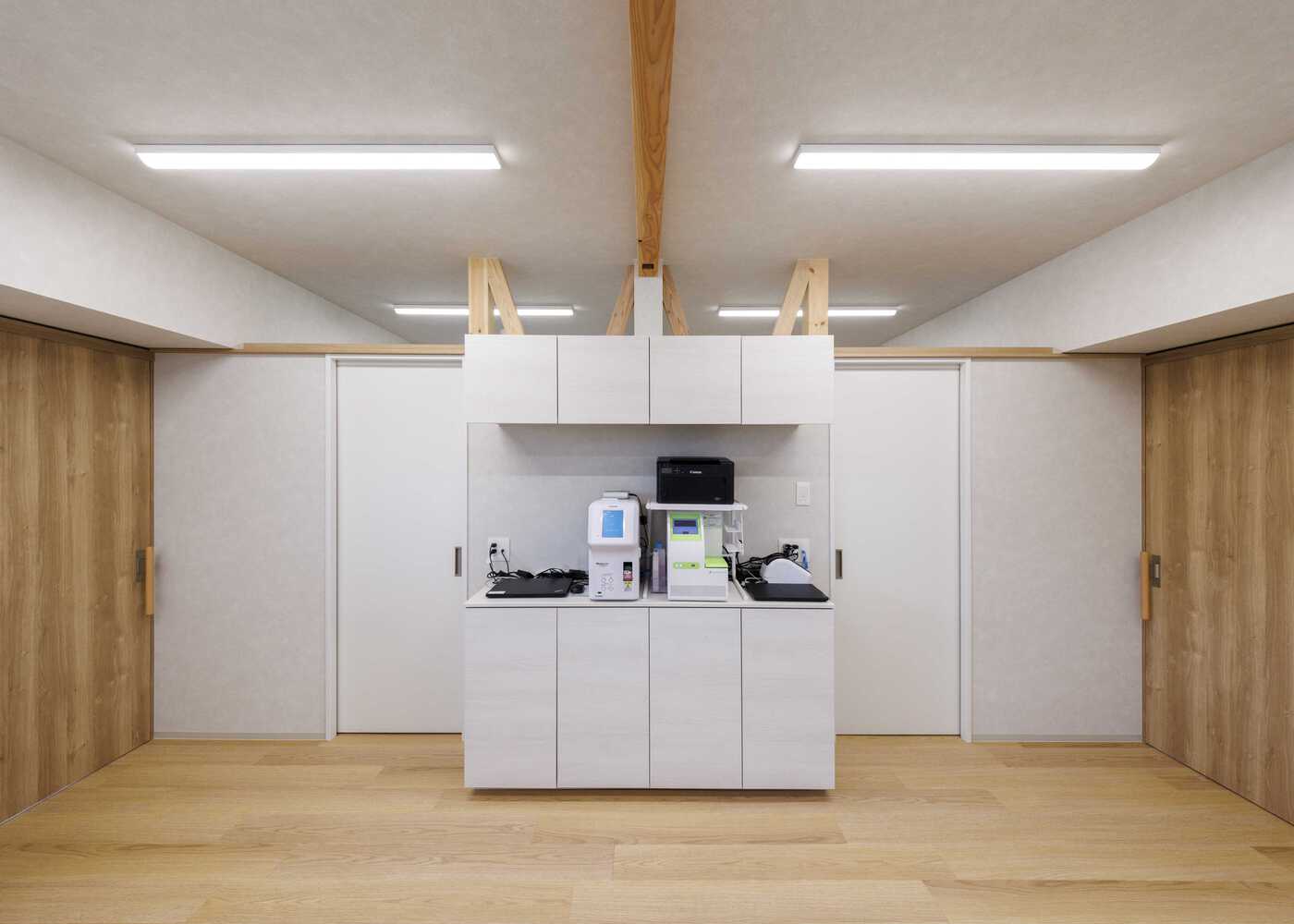儿童诊疗区是空间设计的核心,每一处细节都围绕“消解恐惧、营造安全感”展开。空间采用开阔通透的布局,摒弃了传统诊所封闭的隔间设计,让自然光能够毫无阻碍地洒满室内。大面积的开窗不仅引入了充足的光线,更让孩子们在检查过程中能看到窗外的树木与天空,将注意力从医疗器械转移到自然景观上,有效缓解紧张情绪。​木材的大量运用是营造安全感的关键。木质的墙面、地板、诊疗床以及等候座椅,传递出自然温润的触感与温度,取代了传统诊所常见的不锈钢与瓷砖的冷硬质感。设计团队还在墙面点缀了由木材雕刻的小动物装饰,在地面铺设了带有卡通图案的柔软地垫,这些充满童趣的细节,让诊疗区更像家中的游戏室,让孩子们在轻松的氛围中完成检查。​诊疗流程的空间规划也经过了精心设计:从入口到诊疗床的动线简洁流畅,避免了复杂的转弯与漫长的走廊;医护人员的操作区域与儿童的活动区域既紧密衔接又相对独立,让孩子们不会直面医疗器械的摆放,减少了视觉上的刺激与恐惧。