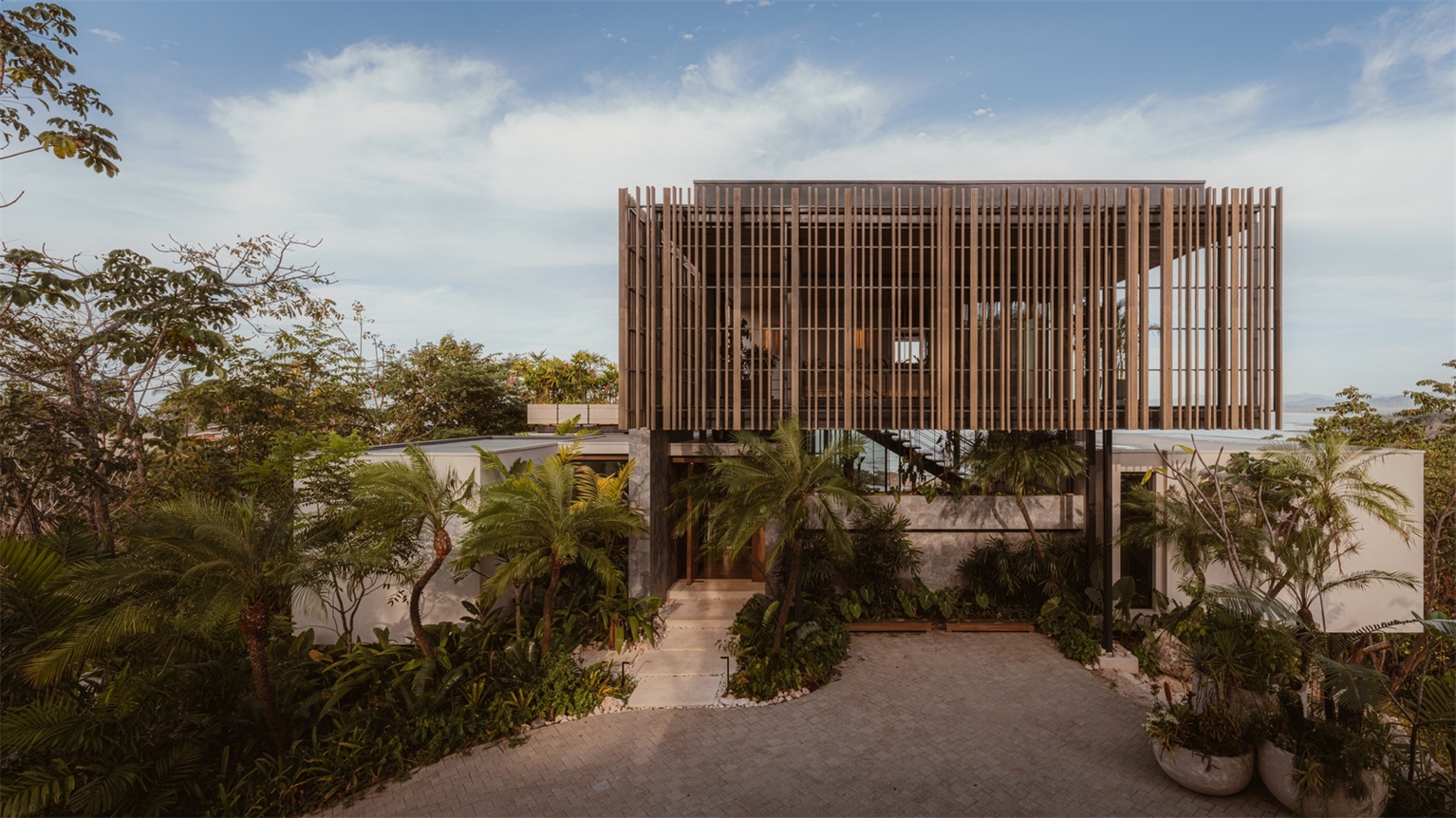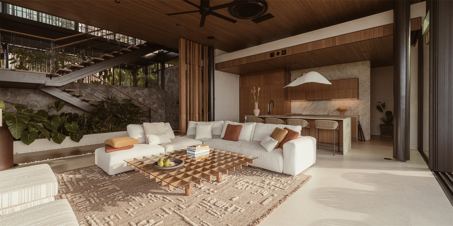 由于地处偏远,这座住宅被设计为一个自给自足的系统。雨水被收集和过滤,能源需求通过太阳能整合和被动式设计策略来满足。遮阳板采用负责任采集的毛竹制成,这种可再生且生长迅速的材料兼具结构强度和气候适应性。这些轻盈的元素减少了太阳得热,促进了空气对流,并增强了建筑体量的悬浮感。再生木材天花板和石材表面确保了建筑的耐久性,且维护需求极低,而可操作玻璃面板则改善了被动制冷效果,减少了对人工气候控制的需求。