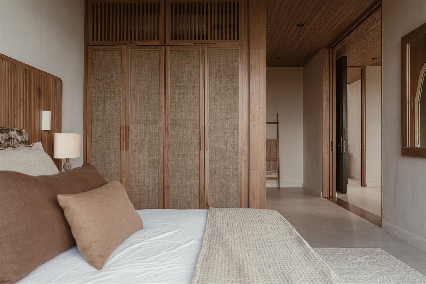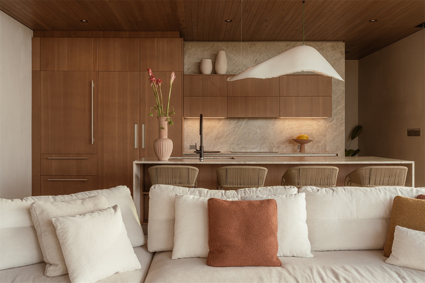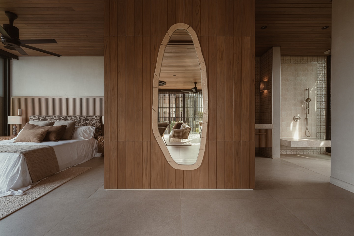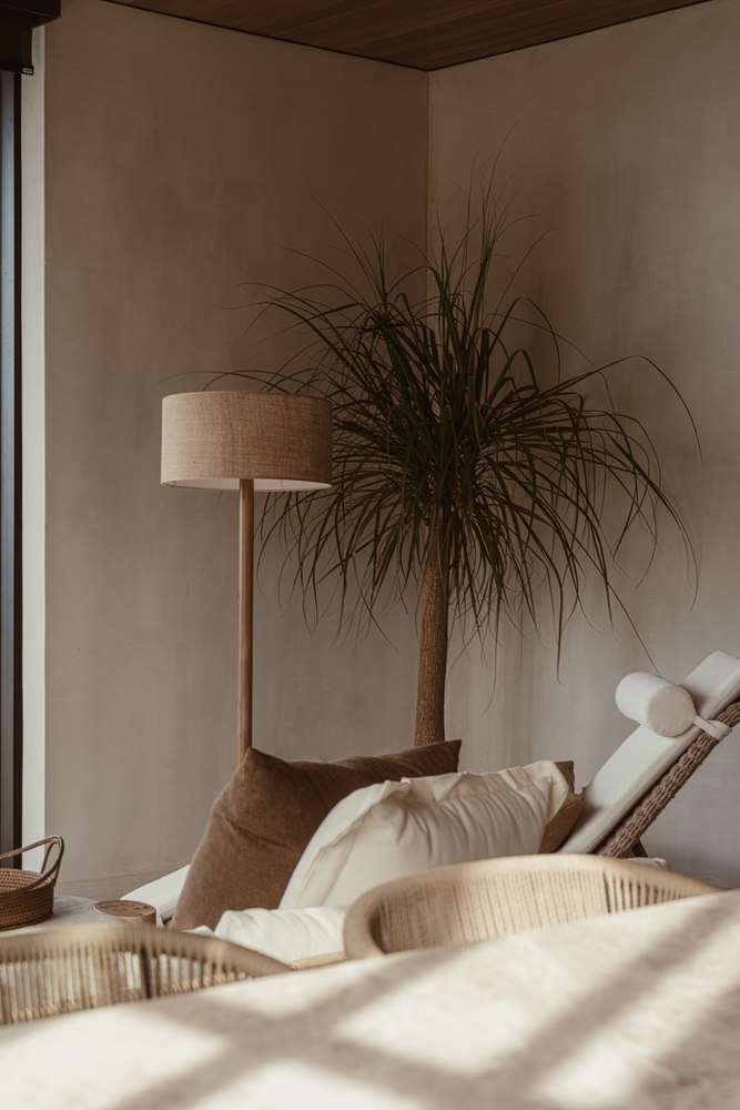 室内设计与建筑外观实现了完美融合。Saxe 工作室从概念设计的最初阶段就负责室内设计和装饰工作,在长达六年的合作过程中,打造出连贯的空间叙事。本地再生木材制成的天花板和天然石材墙面赋予空间质感与连贯性,而柔和的土色调则唤起圣特雷莎的海滨氛围。