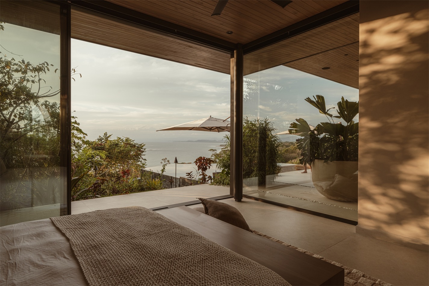 大型玻璃面板搭配纤细边框,在保持热舒适性的同时,不断邀请人们与环境互动。体量之间的间隙空间成为一个宁静的过渡地带,框定着植被,并与树木共同规划出流动的动线。开放式楼梯悬浮在垂直花园中,而露台则层层叠叠地延伸至无边泳池,泳池倒映着天际线。在一年中的某些日子里,人们可以看到月亮从海面升起,这座住宅本身便框定出这一自然奇观。