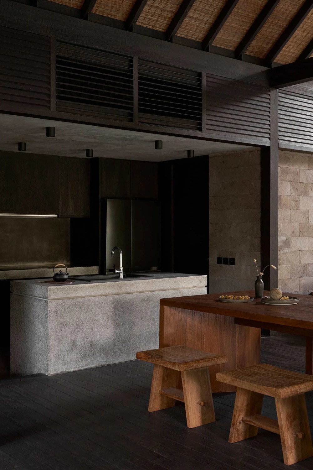 建筑外立面采用 “现场吹制的烧焦木材”,通过 shou sugi ban 技术高温碳化木材表面,形成坚硬的炭化层 —— 黑色的炭化表面不仅具备 “抗腐蚀、防虫害” 的热带气候适应能力,更在视觉上与巴厘岛的火山岩地貌、深绿丛林形成 “冷暖对比”;随着时间推移,烧焦木材会逐渐呈现 “深浅不一的灰色纹理”,如同 “自然在建筑上留下的时光痕迹”,让建筑随丛林一同生长、老化。