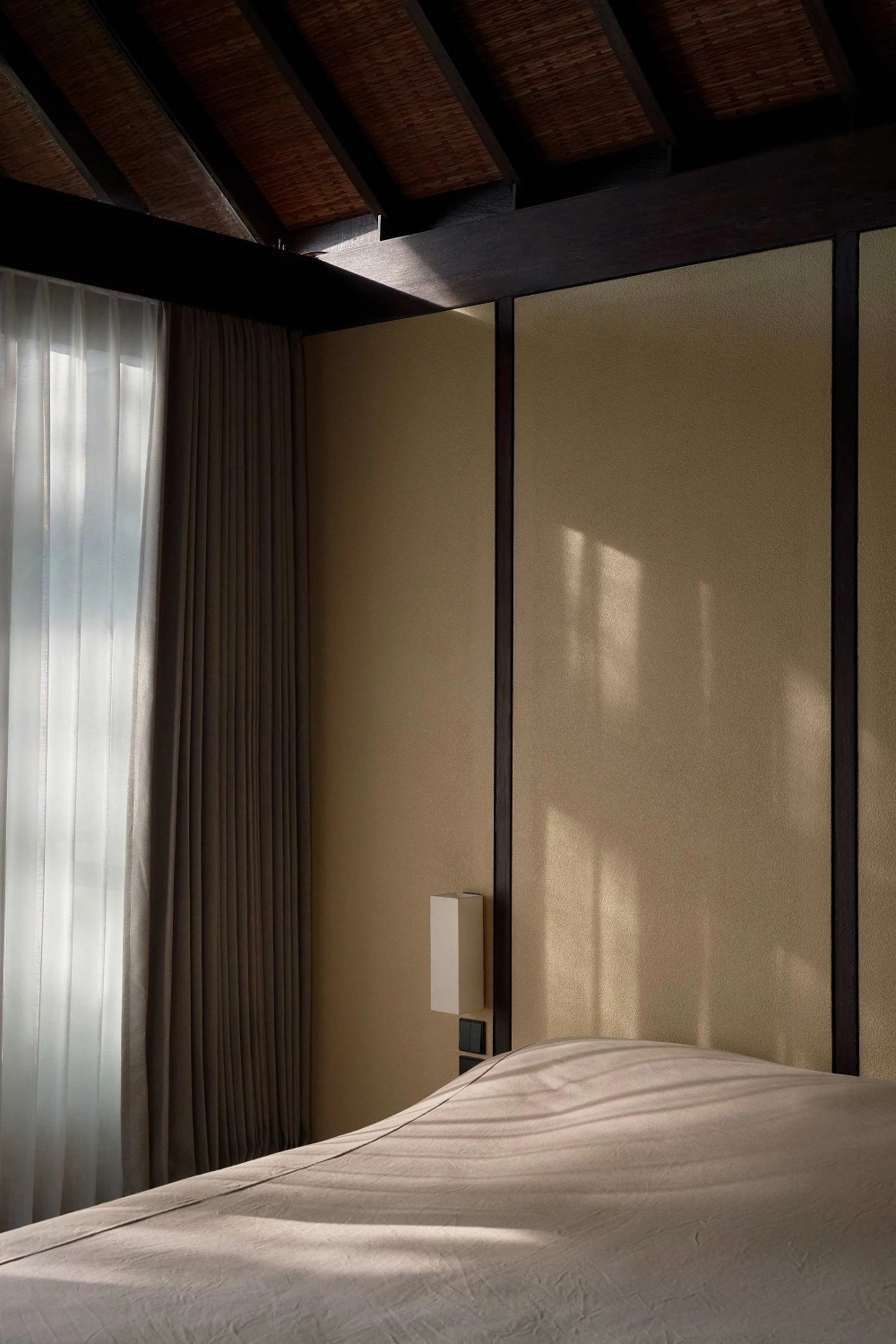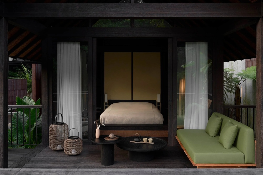 为中和烧焦木材的 “冷硬感”,设计团队大量运用巴厘岛本土材质:室内地面铺设 “天然火山岩地砖”,传递土地的厚重质感;家具选用 “当地硬木” 打造,保留木材的原始纹理与手工打磨痕迹;软装搭配 “巴厘岛传统蜡染布艺”,以柔和的色彩与图案软化空间线条。黑色烧焦木材与火山岩、硬木、蜡染布艺的组合,既实现了 “材质的功能适配”(抗候、耐用),又营造出 “野性中藏精致” 的度假氛围,契合 “低调奢华” 的家庭度假需求。