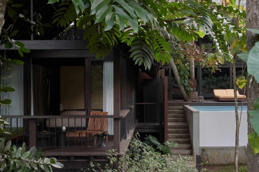 建筑整体采用 “抬高结构”,从泳池区域望去,展馆如同 “脱离地面的浮动树屋”,这一设计既是对苏拉威西巴乔航海社区 “水上生活” 的隐性致敬,又通过 “悬浮” 放大了 “森林前景”—— 站在泳池边,视线可穿透建筑底层的架空空间,直达远处的丛林与河流,避免了 “地面建筑遮挡景观” 的问题,让 “广阔的自然视野” 成为度假体验的核心。