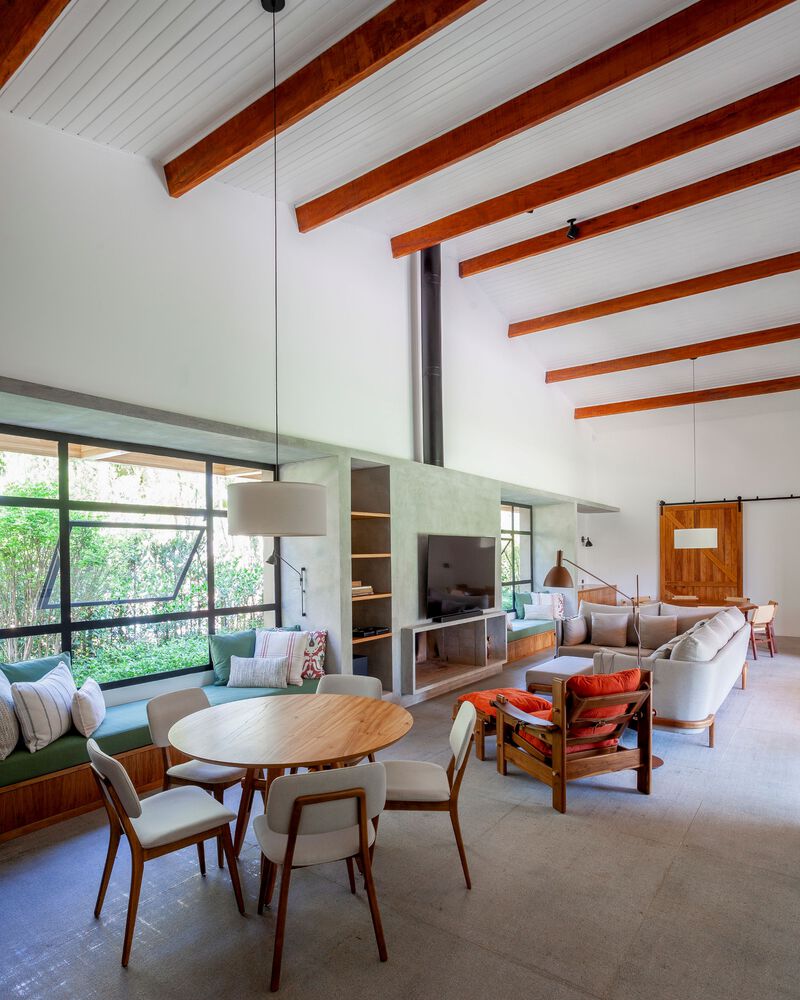 无论是在结构层面,还是在重新建立与自然和谐共生的生活本质方面,此次改造都意义深远。设计保留了部分原始屋顶,以尊重房屋的原有风格,同时采用由 Ita Construtora 提供的胶合木体量进行扩建 —— 这成为新建筑设计的核心元素。这种解决方案不仅带来了结构上的轻盈感与可塑性,还加强了新空间(如主套房、健身房和桑拿房)之间的视觉与功能整合,这些空间均通过凉棚相互连接。