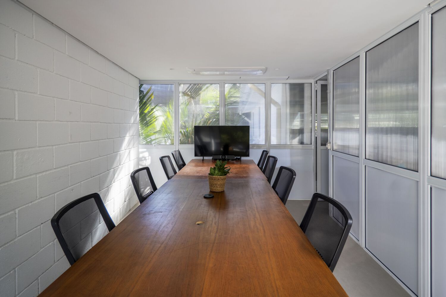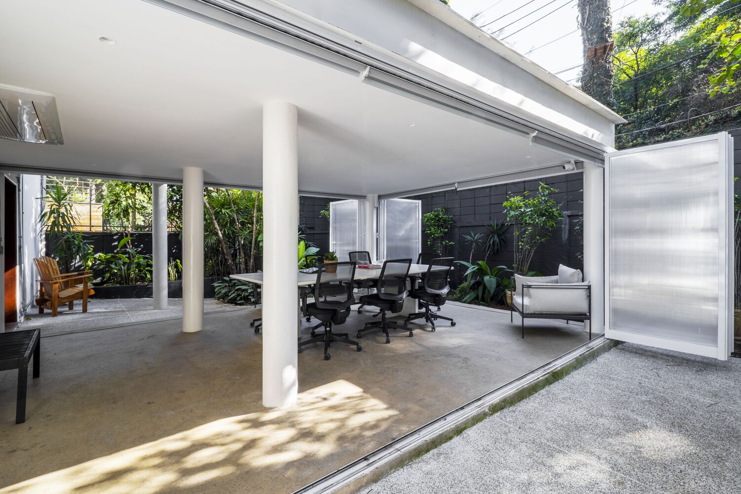 办公空间的设计旨在提升员工的工作效率与幸福感。集体工位区挑高充足、开窗宽大,经树冠过滤后的自然光在此洒落,营造出既宁静又充满活力的氛围。会议室分布在不同建筑区块中,配备可完全向庭院开启的大型门体,让会议时光也能与自然环境产生联结。办公家具线条简洁、材质中性,进一步强化了整体设计的极简风格。