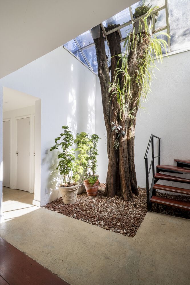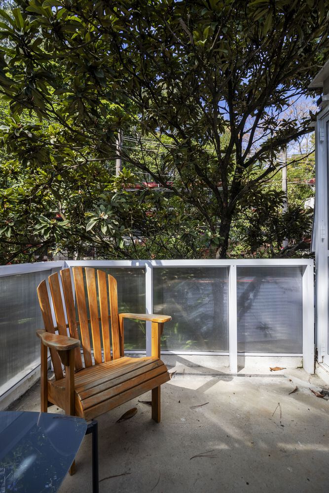 在项目的多个区域,设计师巧妙地在植被旁设置了休闲解压区,配备木质平台、长椅与扶手椅等自然材质家具,打造出小型 “内部庭院”,进一步加强了空间与自然的联系。建筑区块之间的通行依靠石板小径实现,小径被自然树荫覆盖,白色立柱点缀其间,支撑着宽敞的屋檐。