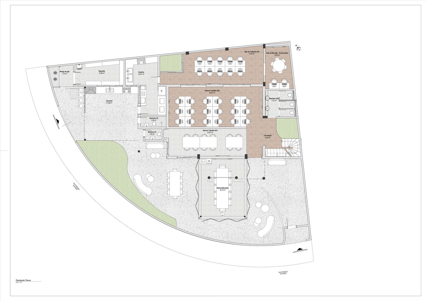 从外部来看,庭院无疑是空间的核心亮点。庭院采用自然有机的设计手法,融入了蜿蜒的天然石板小径与树荫下的休憩区,成为日常工作中供人短暂休息、沉思放松的场所。建筑与景观的融合是该项目的核心设计原则。此空间不仅满足了基本功能需求,更探索了全新的办公空间使用方式 —— 更流畅、轻盈且富有人文关怀。