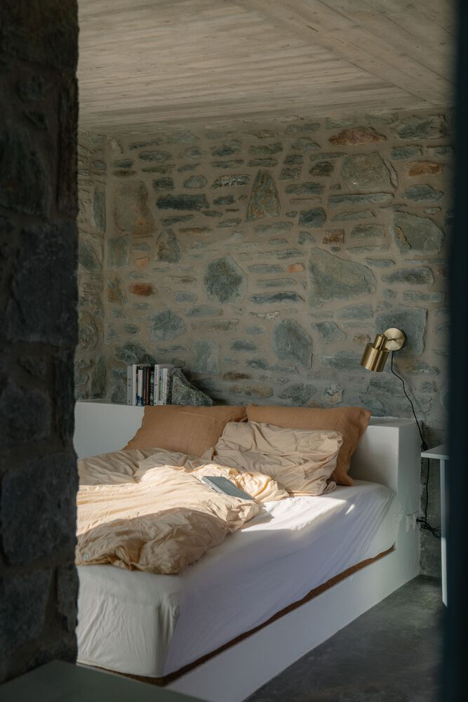 “户外之家” 是基斯诺斯岛(Kythnos Island)附近 “皮佩里住宅”(Piperi House)的客房,它坐落于山坡露台之上,与天然石材景观完美融合。入口形似花园门,进入后,皮佩里岛(Piperi Island)的景致映入眼帘,与由两道平行石墙围合而成的无边界露台融为一体。在这里,岩石与大海仿佛交融在一起,将岛屿的自然之美延伸至陆地。继续前行,视野愈发开阔,带有石制基座的 “户外之家” 便映入眼帘。