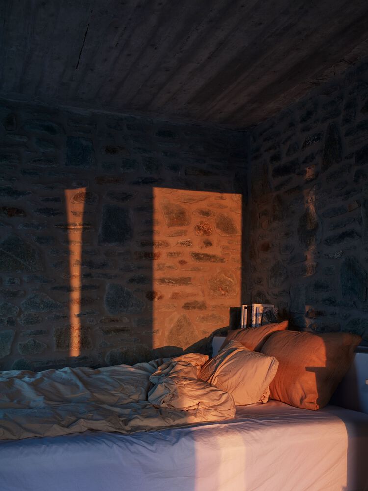 夜晚时分,一间由当地石材建造的小屋可遮风挡雨,屋内配备了床、工作区和卫生间等基本生活设施,这是住宅中唯一设有供暖系统的空间,供人们进行室内活动。该设计鼓励客人拥抱户外生活,同时沉浸在岛屿的自然与宁静之中。