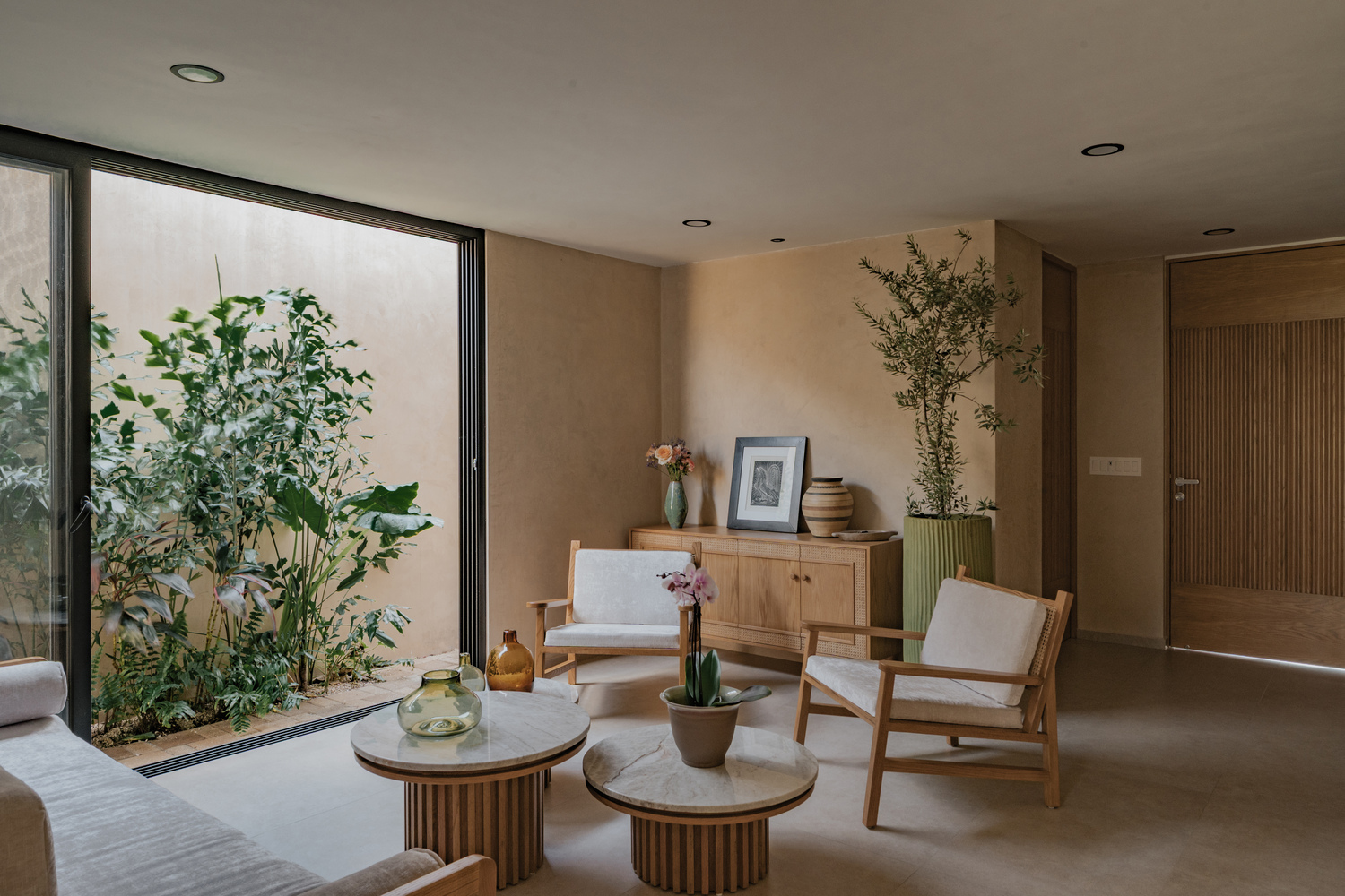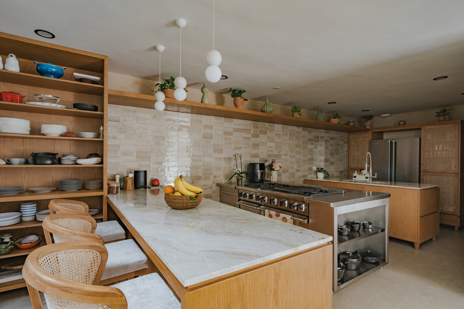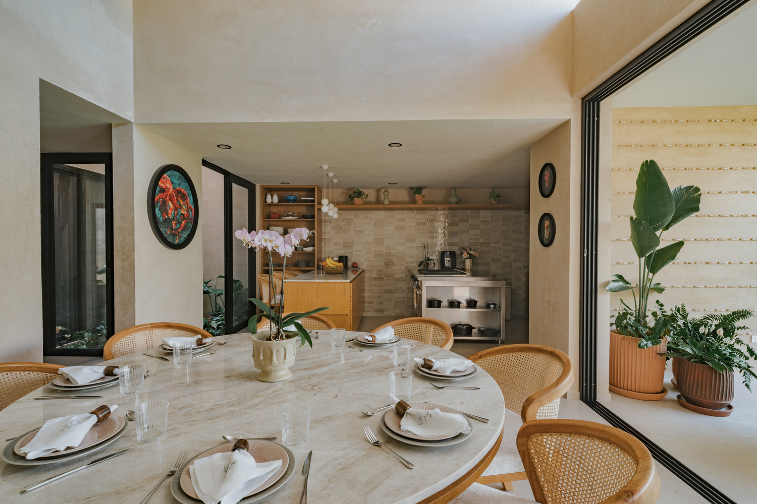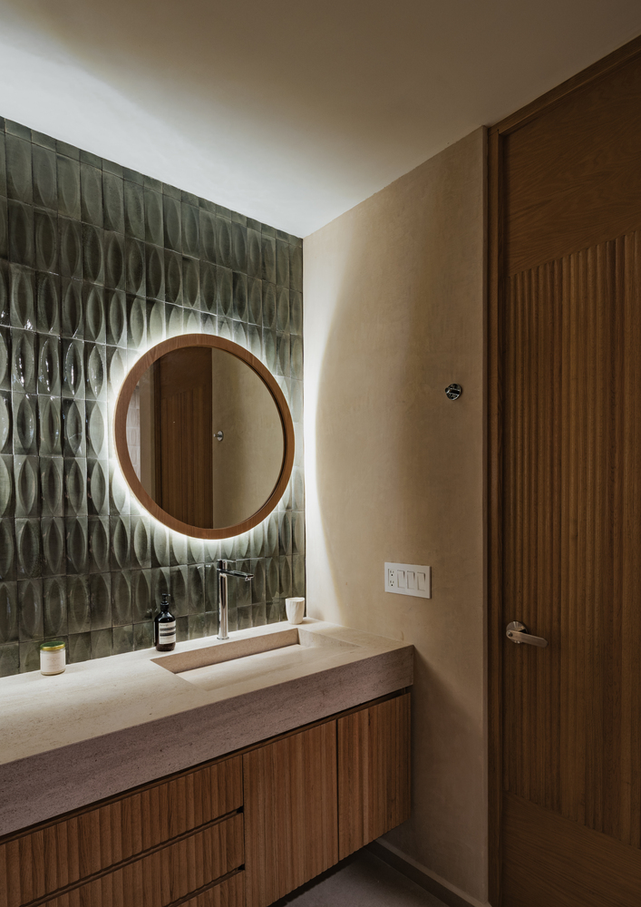 每个空间的设计都为新的生活方式服务,却不背弃其本源。厨房专为家中的主厨设计,不仅实用,更承载着仪式感 —— 这里是分享、创造与享受生活的空间。由当地 “adocreto”(一种传统混合材料)制成的百叶窗,以低调、实用且富有象征意义的美感,过滤着阳光与时光。