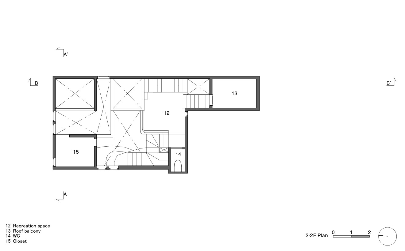 借助旗杆部分 3 米宽的空间,设计团队构思了一个让房屋部分结构侵占旗杆区域的方案。客户一家五口希望房屋足够紧凑,有充足的私密房间空间,满足基本居住需求,同时兼具趣味性和独特性。