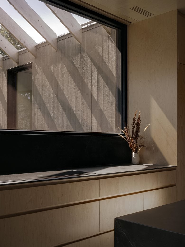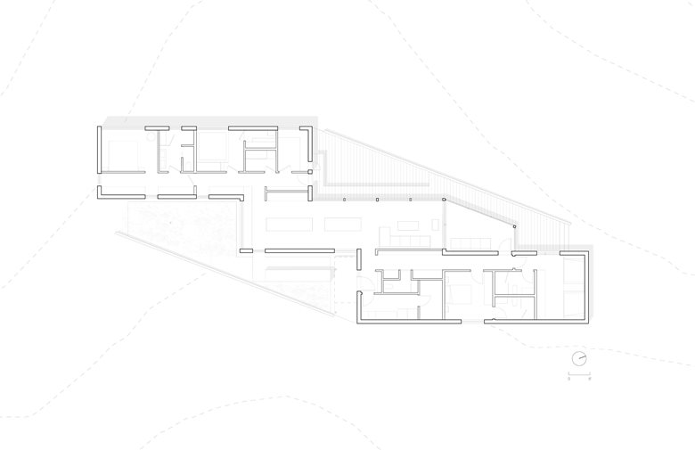 室内色调较为简约,主要采用胶合板包覆;在与屋顶几何形态相契合的基准线下方,选择性地使用了白色墙面,以突出艺术品的展示。包括室内水疗区在内的潮湿区域则采用了对比鲜明的瓷砖饰面,形成触感和视觉上的区分。尽管最终呈现的建筑看似复杂,但其基础源于人们熟悉的比例和传统形态。它的独特之处在于这些形态之间的相互作用,以及它们与景观的对比 —— 由此打造出的住宅既能框定自然环境,又能与之交融互动。