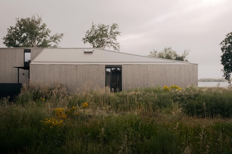 南湾湖边度假屋设计(South Bay Residence)坐落于安大略省一处平坦的乡村地块上,位于多伦多以东几小时车程处。该地块朝北延展,拥有一片广阔的开阔田野,周边环绕着一小片树林,还有一片海岸线 —— 海岸线上生长着形态独特、种类多样的树木,这些树木成为了建筑设计理念中不可或缺的一部分。