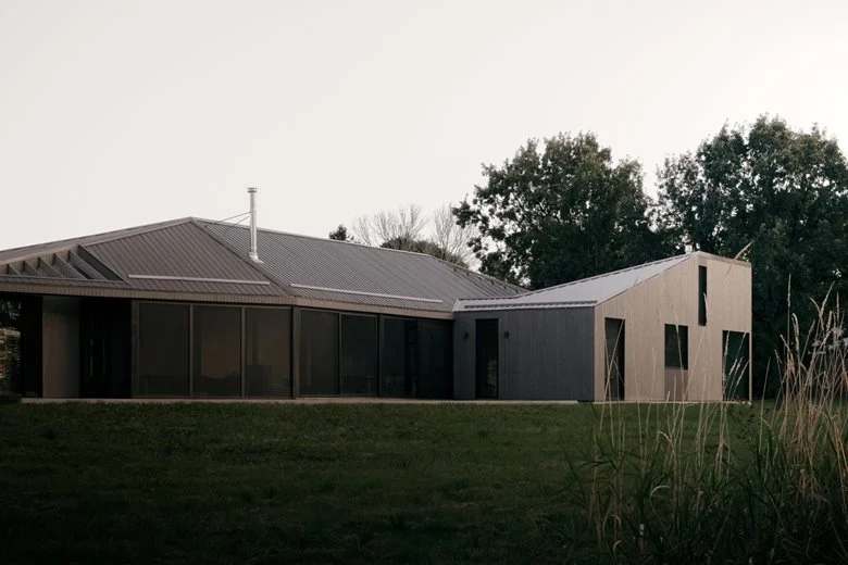 屋顶由三个对称的单坡结构组成。在主要的生活条带区域,这些结构相互交叉,在统一的顶棚下形成受保护的户外空间,兼具遮雨和遮阳功能。这样的屋顶形态为原本平坦的地块增添了富有动态的地形感,吸引视线追随其起伏的轮廓 —— 就像人们欣赏连绵的丘陵或错落的山脉那样。这种设计在实用性(排水功能)与雕塑感之间取得平衡,为室内外体验都增添了丰富性。卧室和生活空间都因这种富有表现力的几何形态而受益,增强了空间的体量感,也让项目对乡村传统建筑风格做出了富有当代感的重新诠释。
