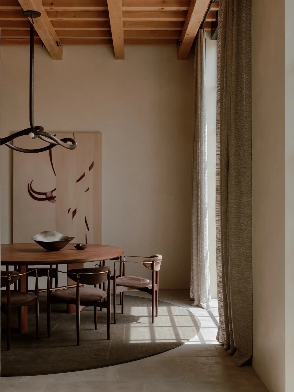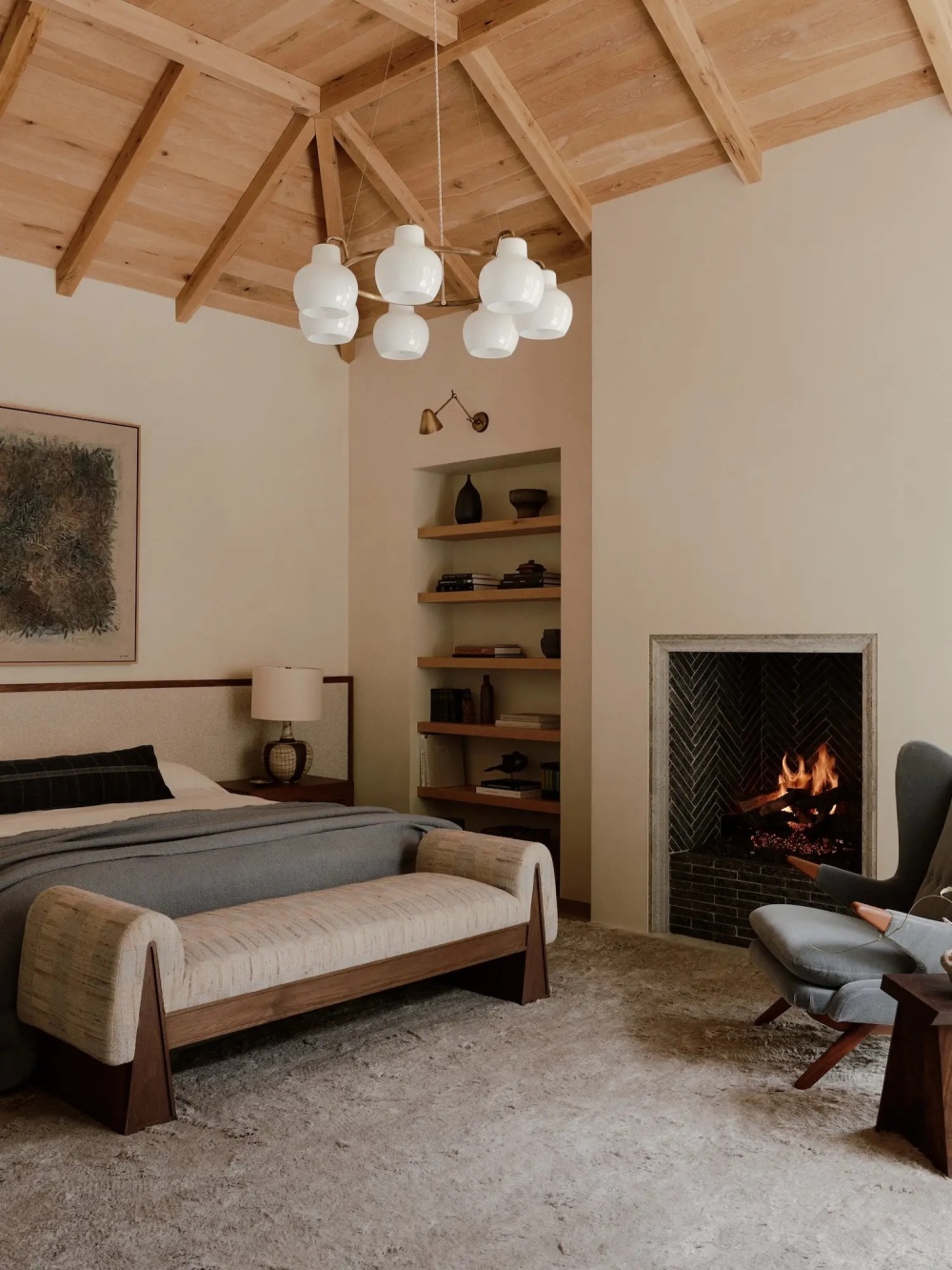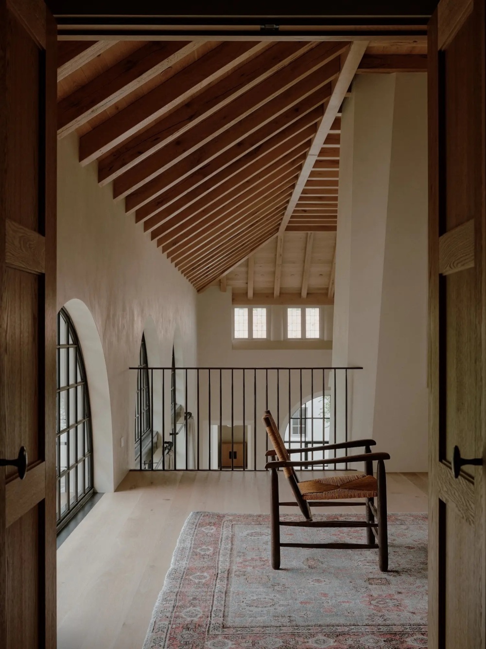 客厅采用 Michael Imber 标志性的 “传统坡屋顶” 与 “厚重木质梁柱”,营造出 “宏伟的空间尺度”,但 Vanessa Alexander 通过 “低矮的模块化沙发”“可移动的布艺靠垫” 与 “温暖的原木茶几”,弱化了传统建筑的压迫感,注入 “可随意放松” 的家庭氛围;餐厅的长桌选用 “温润的实木材质”,搭配 “简约金属吊灯”,既保留了高端住宅的精致感,又避免了 “ formal dining(正式用餐)” 的拘谨,契合家庭 “日常聚餐 + 偶尔宴请” 的双重需求;主卧套间延续 “低调奢华” 的核心,墙面采用 “浅米色肌理漆”,地面铺设 “实木地板”,软装以 “灰调布艺床品 + 深绿丝绒躺椅” 组合,既保证了休憩的舒适感,又通过材质的细腻对比(布艺的柔软与丝绒的光泽)传递 “优雅质感”;次卧则根据家庭成员需求,设计为 “兼具书房功能的灵活空间”,定制的嵌入式书架与折叠书桌,让空间在 “休憩” 与 “工作” 之间自由切换,体现 “贴合生活方式” 的设计初心。