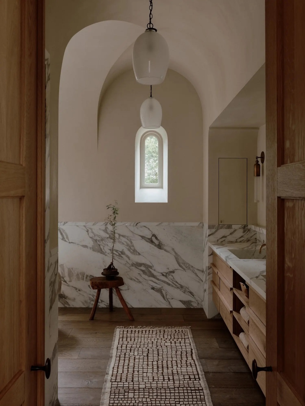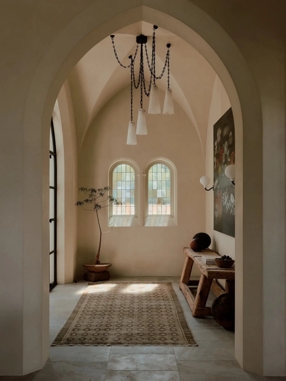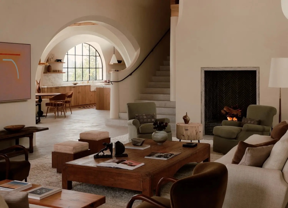 客厅采用 Michael Imber 标志性的 “传统坡屋顶” 与 “厚重木质梁柱”,营造出 “宏伟的空间尺度”,但 Vanessa Alexander 通过 “低矮的模块化沙发”“可移动的布艺靠垫” 与 “温暖的原木茶几”,弱化了传统建筑的压迫感,注入 “可随意放松” 的家庭氛围;餐厅的长桌选用 “温润的实木材质”,搭配 “简约金属吊灯”,既保留了高端住宅的精致感,又避免了 “ formal dining(正式用餐)” 的拘谨,契合家庭 “日常聚餐 + 偶尔宴请” 的双重需求;主卧套间延续 “低调奢华” 的核心,墙面采用 “浅米色肌理漆”,地面铺设 “实木地板”,软装以 “灰调布艺床品 + 深绿丝绒躺椅” 组合,既保证了休憩的舒适感,又通过材质的细腻对比(布艺的柔软与丝绒的光泽)传递 “优雅质感”;次卧则根据家庭成员需求,设计为 “兼具书房功能的灵活空间”,定制的嵌入式书架与折叠书桌,让空间在 “休憩” 与 “工作” 之间自由切换,体现 “贴合生活方式” 的设计初心。