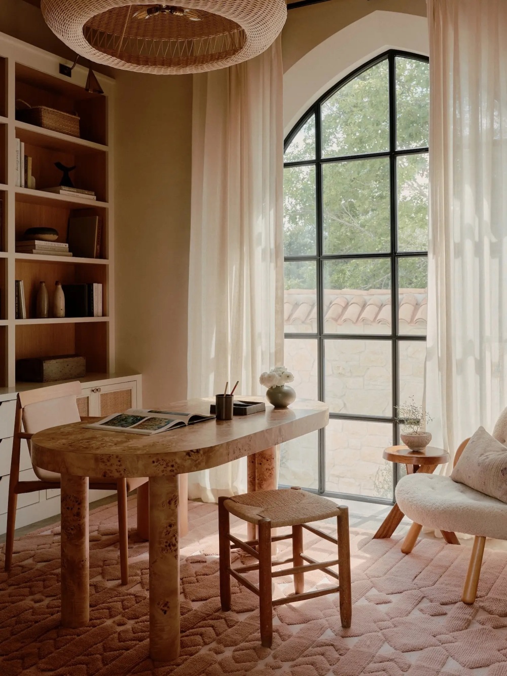 建筑外立面采用 “德克萨斯州本土石材” 与 “深色金属屋面”,石材的粗糙肌理传递传统建筑的 “在地性与耐久性”,金属屋面的利落线条则注入现代简约感;室内延续 “材质的对话”—— 墙面的 “实木护墙板”(传统元素)与 “玻璃隔断”(现代元素)结合,地面的 “石材拼花”(传统工艺)与 “浅灰地毯”(现代软装)搭配,既保留了传统建筑的温度,又避免了 “复古风格的陈旧感”;整体色彩以 “大地色系” 为基底 —— 墙面的米白、地板的浅棕、庭院的绿植绿,共同构建 “温暖舒适” 的空间氛围,契合家庭 “长期居住” 的情感需求;在此基础上,通过 “局部亮色” 点缀现代感:如客厅的 “深蓝丝绒窗帘”、餐厅的 “黄铜餐具摆件”、主卧的 “墨绿装饰画”,这些色彩 “点到即止”,既打破了大地色系的单调,又不破坏整体的 “宁静感”,完美诠释 “低调奢华” 中 “藏精致于细节” 的内核。