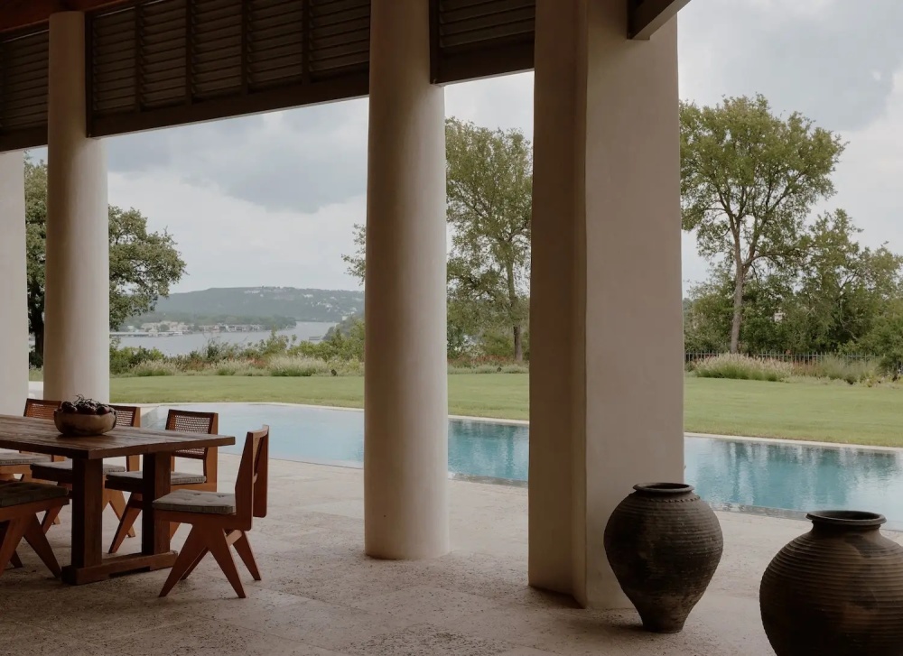 该别墅设计在德克萨斯州奥斯汀湖的悬崖之上,建筑师 Michael Imber 与室内设计师 Vanessa Alexander 跨界合作,为回归故乡的年轻家庭打造了一座 “兼具宏伟与轻松” 的永久居所。这座两层住宅以 “低调奢华” 为核心,在 6000 平方米的湖景地块上,围绕中央庭院构建 “室内外流动共生” 的空间秩序,既保留了 Michael Imber 传统建筑的厚重肌理,又注入 Vanessa Alexander 现代轻松的室内能量,最终让房子成为 “贴合家庭生活方式、呼应奥斯汀湖景观” 的温暖容器,重新定义了 “传统与现代融合” 的高端住宅设计范式。