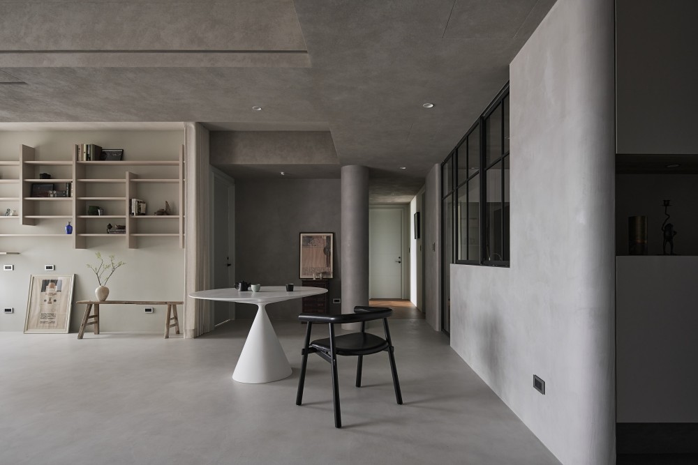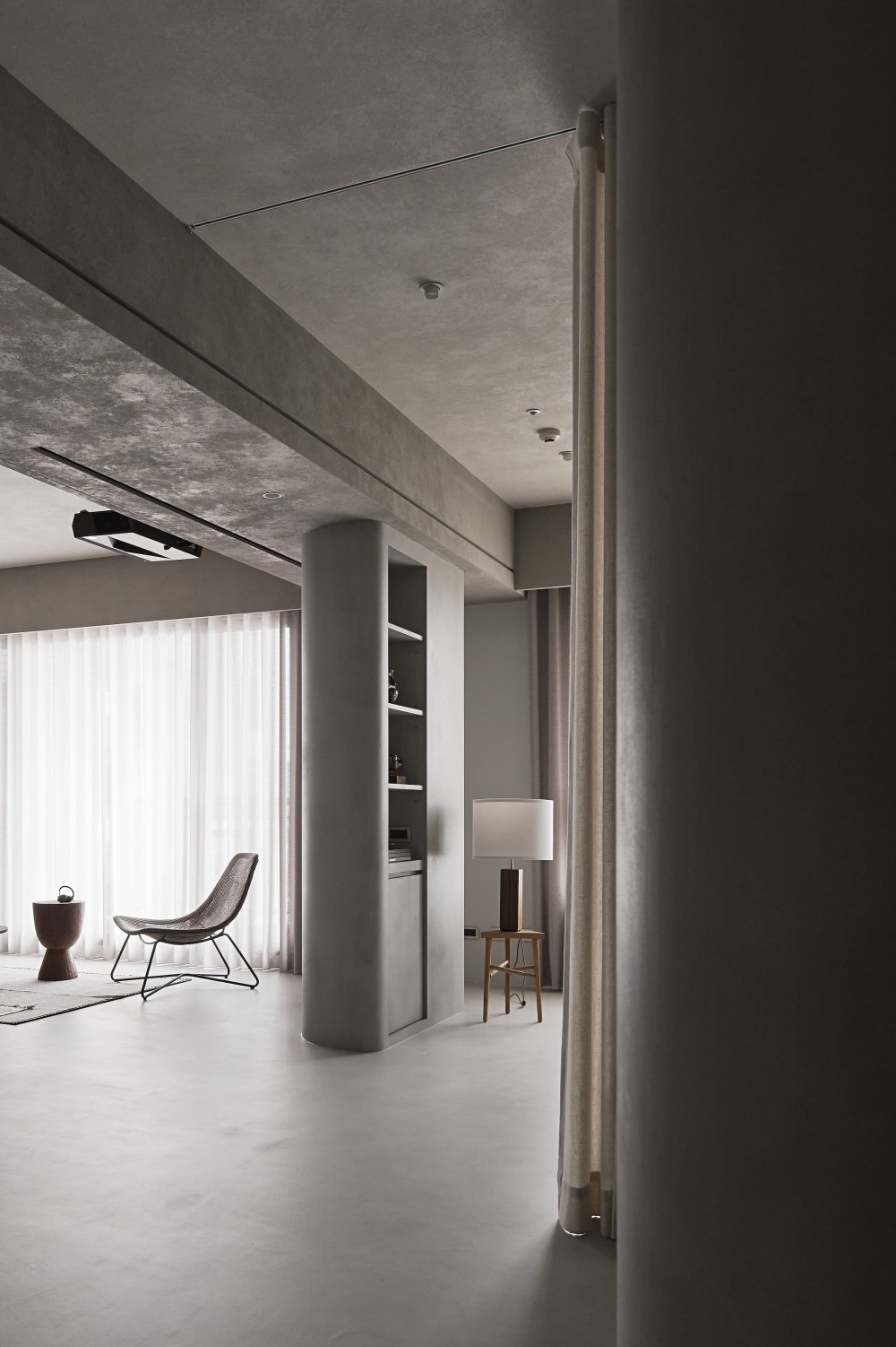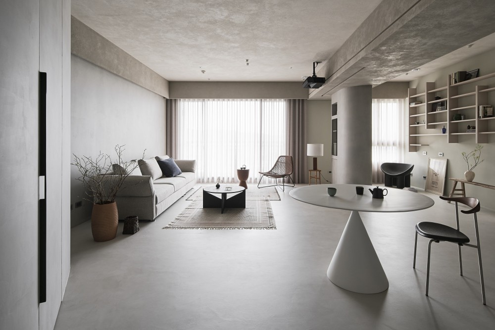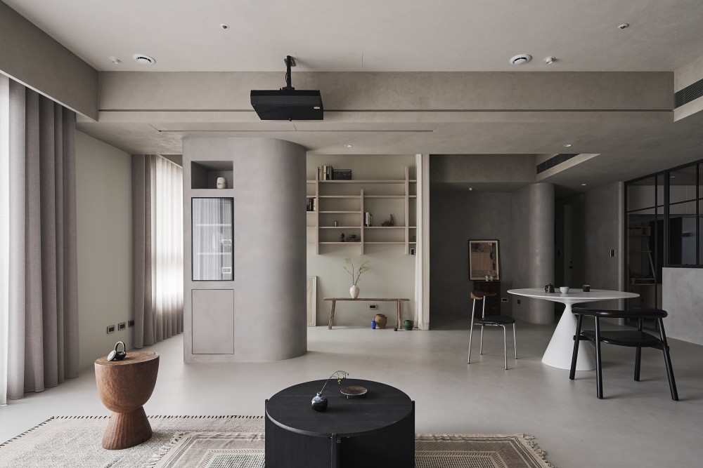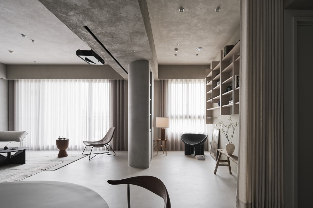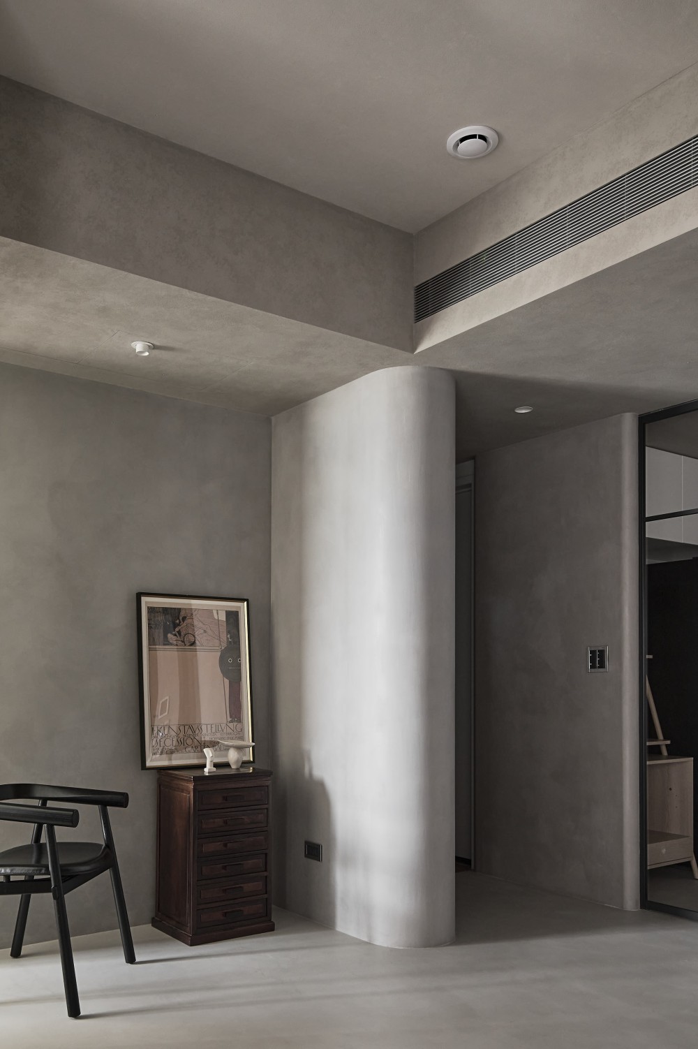 该亲子住宅设计理念:成为父母,生命开启全新篇章。本案从亲子宅出发,围绕小孩主题,却不流於稚气,兼顾大人需求,营造和谐诗意的住家。采中心释放方式,机能往四周摆、中央留空,并以悬空书架与投影机让出地面,放大空间,让孩子恣意奔跑。置入储藏墙体、走道柱体与圆桌等弧形量体,为通透公领域增添隐微引导,凝聚视线朝向窗景。柱体与孩房间的口袋空间,则作为公私领域缓冲,让动线有停顿,烘托出景深层次。
