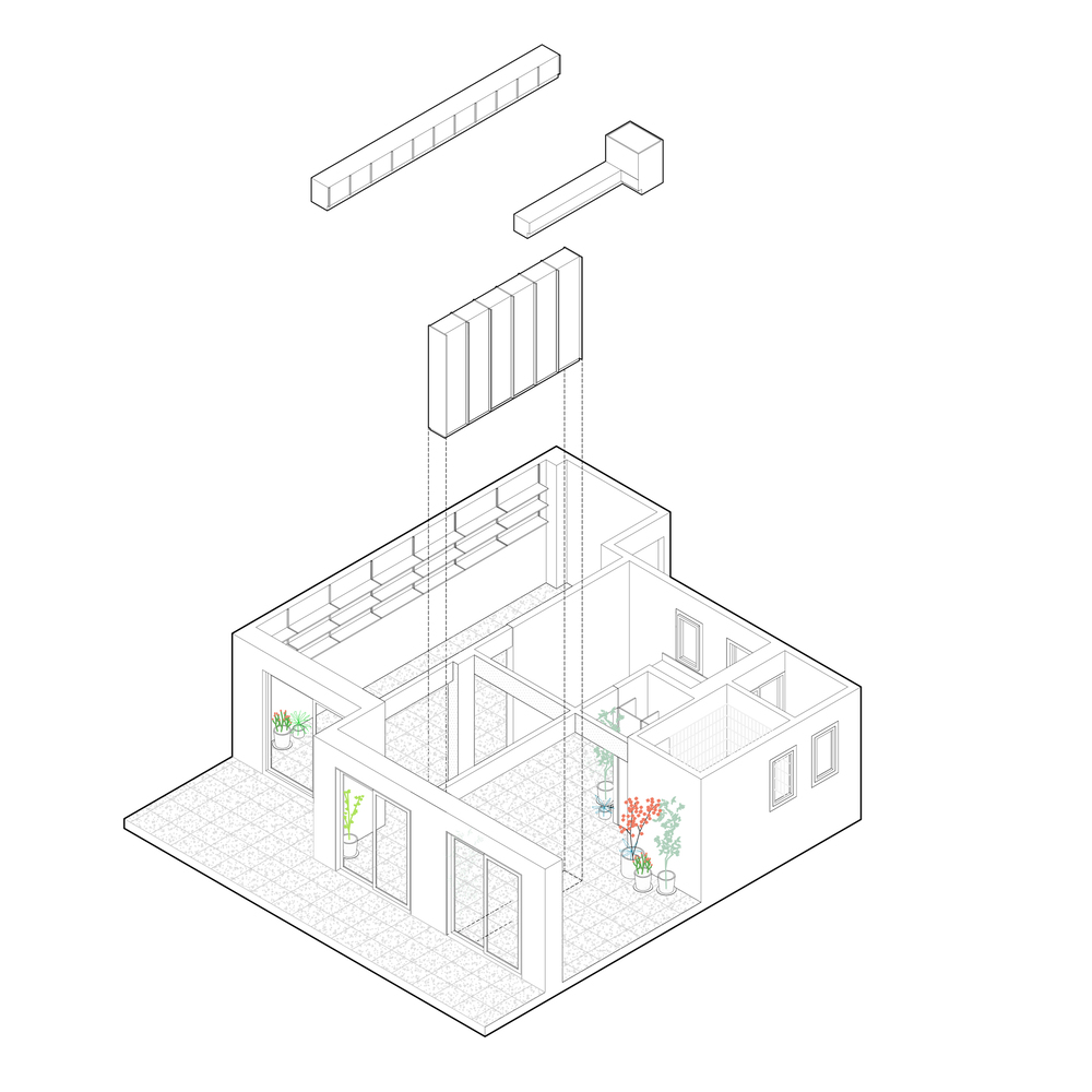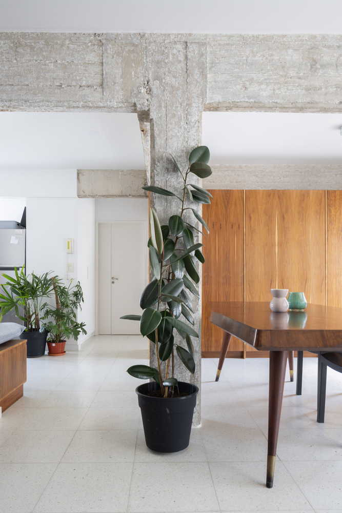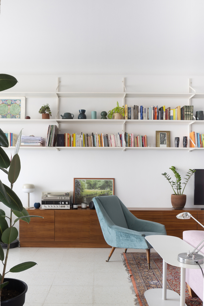 另一方面是材料的选择。采用单一的地板材质、单一的木材种类,以及反复使用的同一款灯具。白色花岗岩马赛克的出现,取代了之前的人造材料,这几乎像是一种原则性的宣告,再加上裸露钢筋混凝土结构的处理,使整个空间更加完整。三件香木家具:衣柜、厨房台面和抽屉柜,与一个大型的模块化金属书架相互搭配,划分并组织了空间,为索菲亚的新生活方式提供了支持。