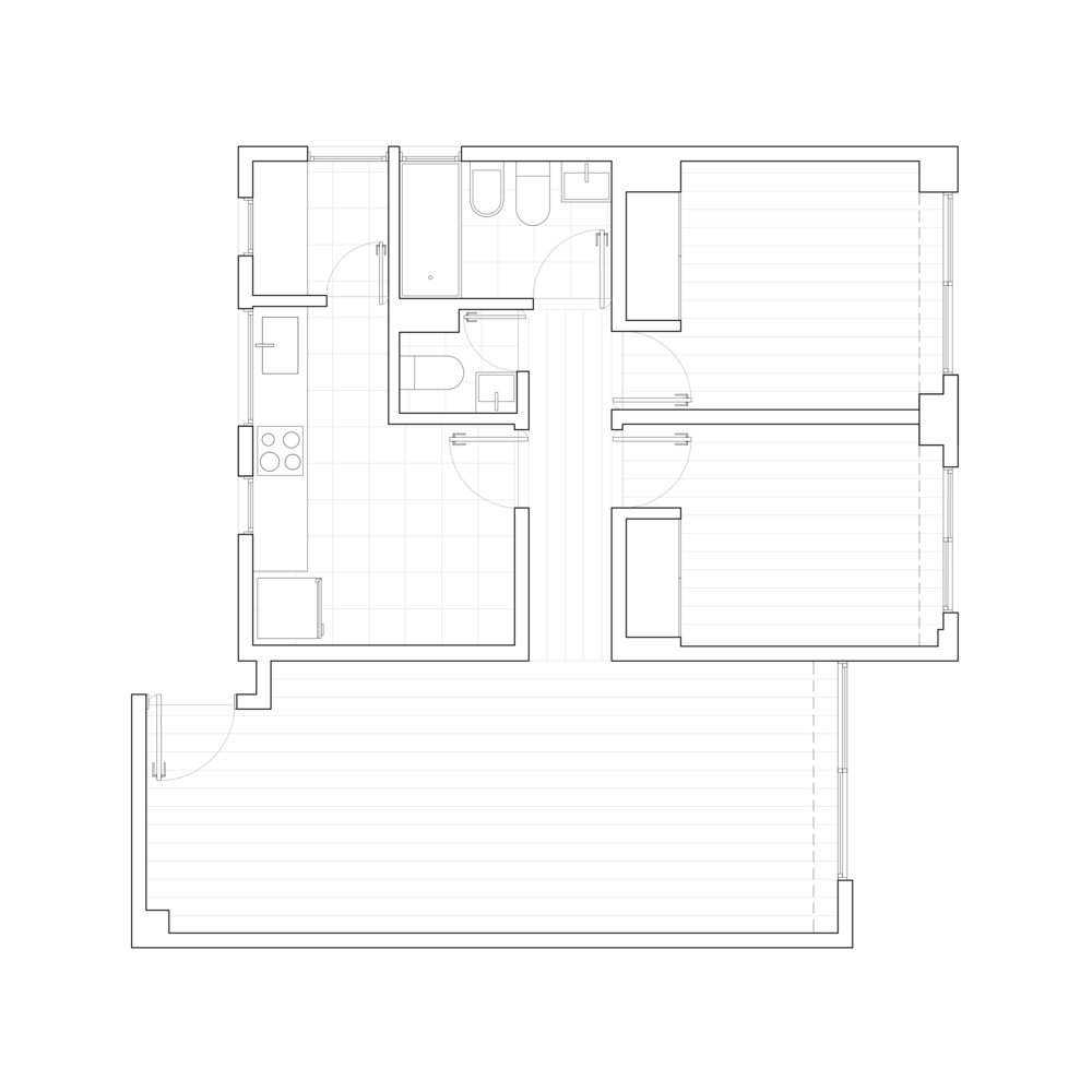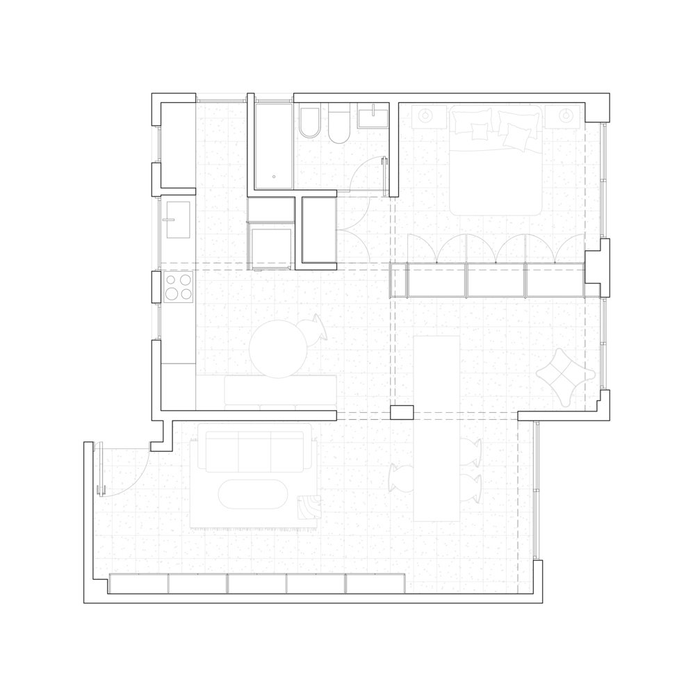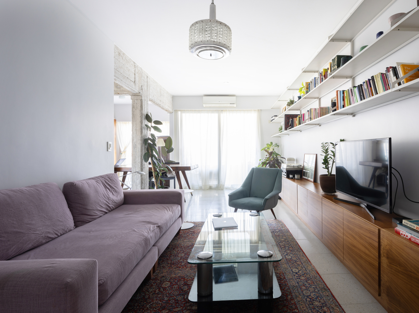 在布宜诺斯艾利斯市,有一套 70 平方米的小户型公寓设计,原本是为典型的传统家庭设计的,近年来却一直由一位在此居住和工作的年轻女性使用。既然在公寓各个空间进行的活动往往相似,比如在床上用笔记本电脑工作、在扶手椅上打盹、在厨房写作,那么保留没有穿堂风的独立隔间空间是否合理呢?对于一个人居住的公寓来说,设置一间浴室和一间卫生间是否必要?两个房间呢?厨房和洗衣房之间的门,以及卧室的门又是否有存在的意义呢?