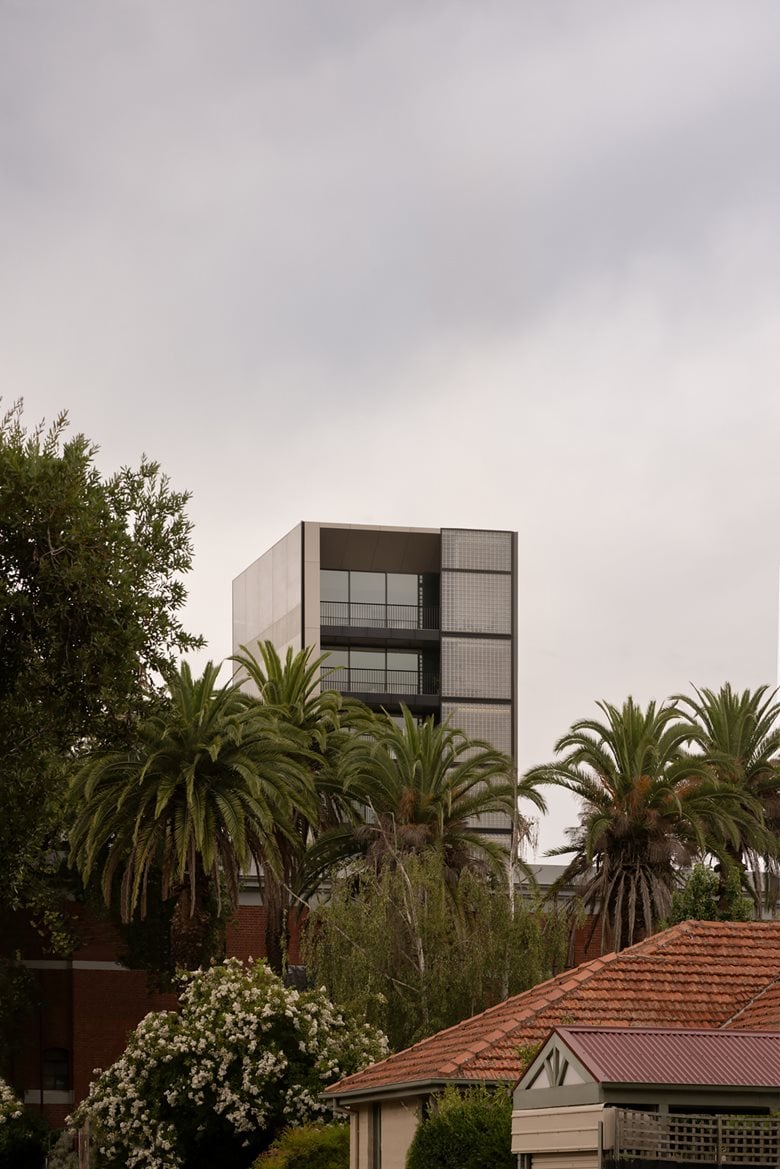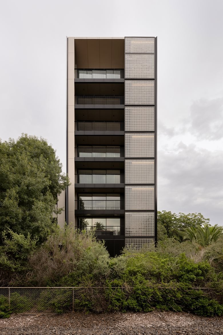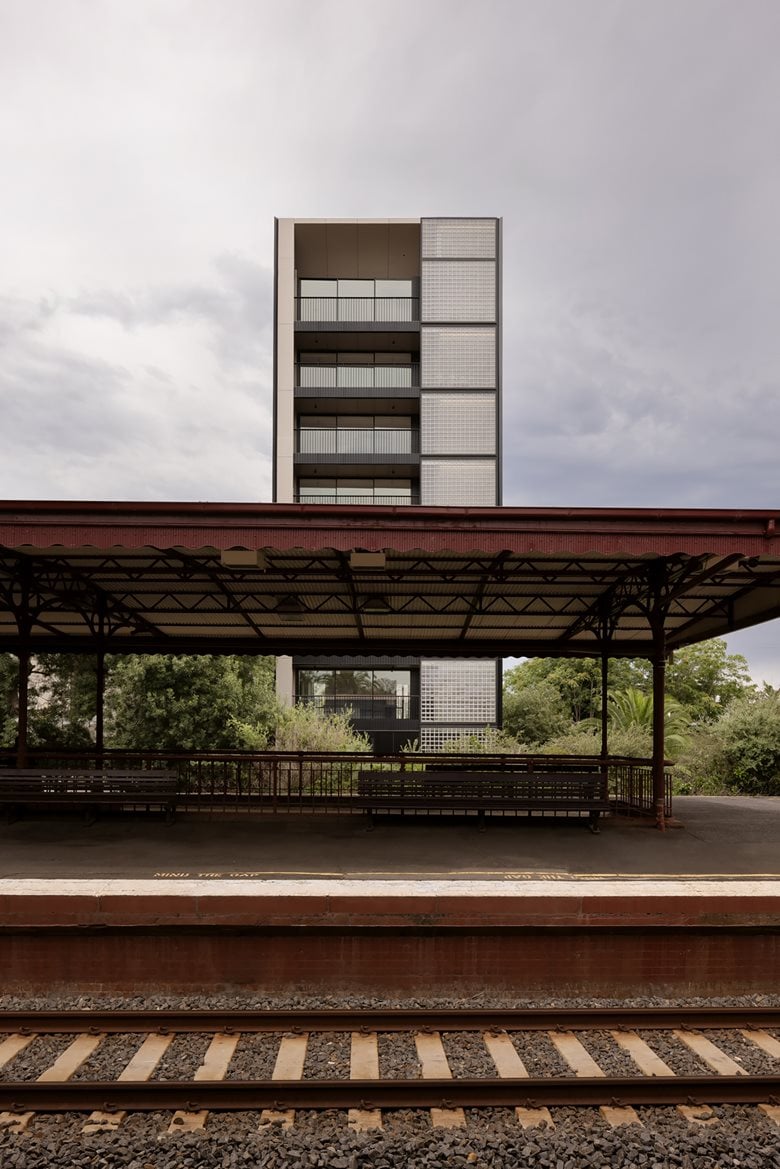 纽堡灯塔公寓楼设计便捷地坐落于奥本村(Auburn Village),是一套高度可持续的住房解决方案。该住宅建于一片面积仅 150 平方米、且几乎不具备建造条件的场地之上,紧邻一座历史悠久的火车站,共 10 层,可容纳多达 21 人居住。由于项目无街道直接出入口,且北立面紧邻维克铁路公司(VicTrack)的用地,因此消防规范、施工工艺、声学要求、公平采光及结构稳定性等复杂条件,在很大程度上主导了整个设计过程。