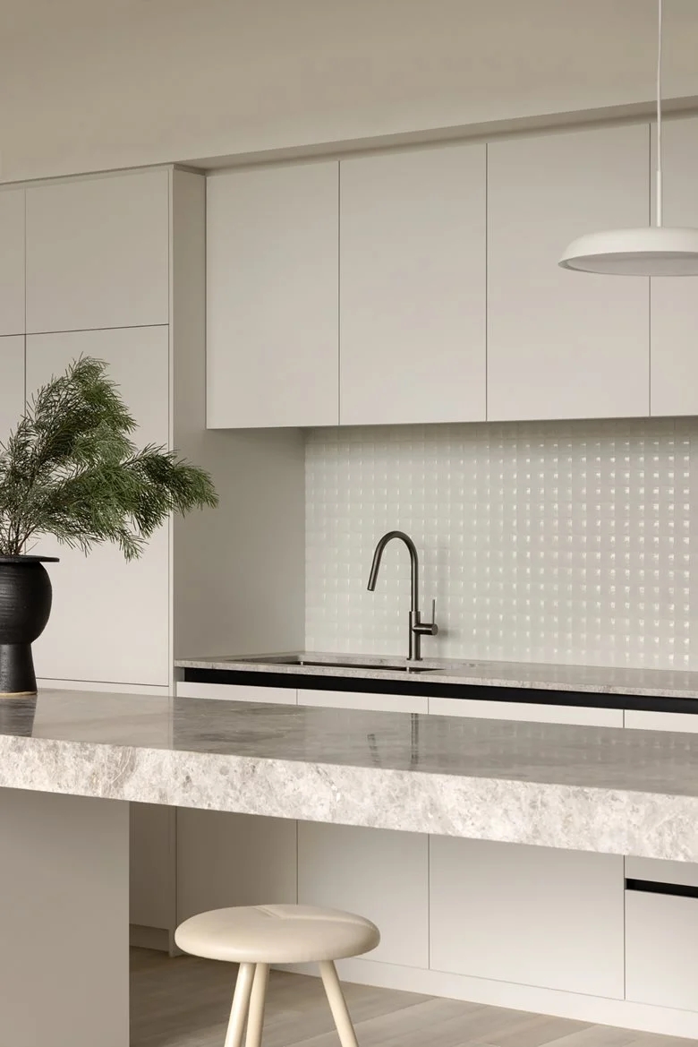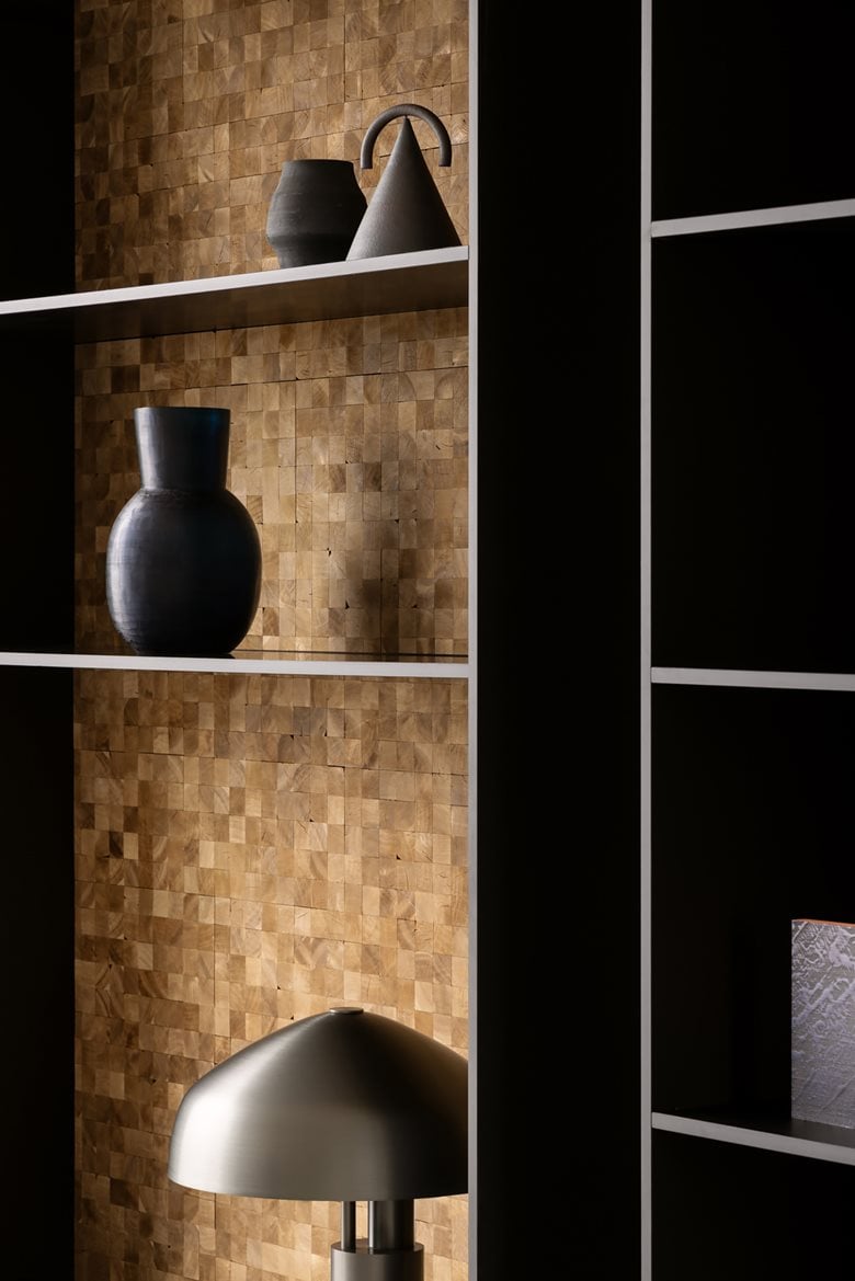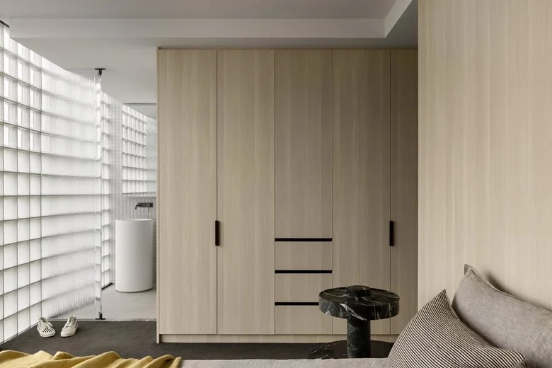 室内材料选用延续了建筑立面的网格设计语言,采用木质镶板、天然石材与陶瓷瓷砖。玻璃砖作为独特的室内饰面,全天随光线变化营造出丰富灵动的光影效果。带纹理的玻璃门与玻璃内墙,实现了光线在楼层间的穿透与流动。建筑顶层为定制化阁楼公寓,其中一户更是采用双层挑高设计 —— 即便整体采用高效的模块化设计,仍为住户提供了独特的居住选择。