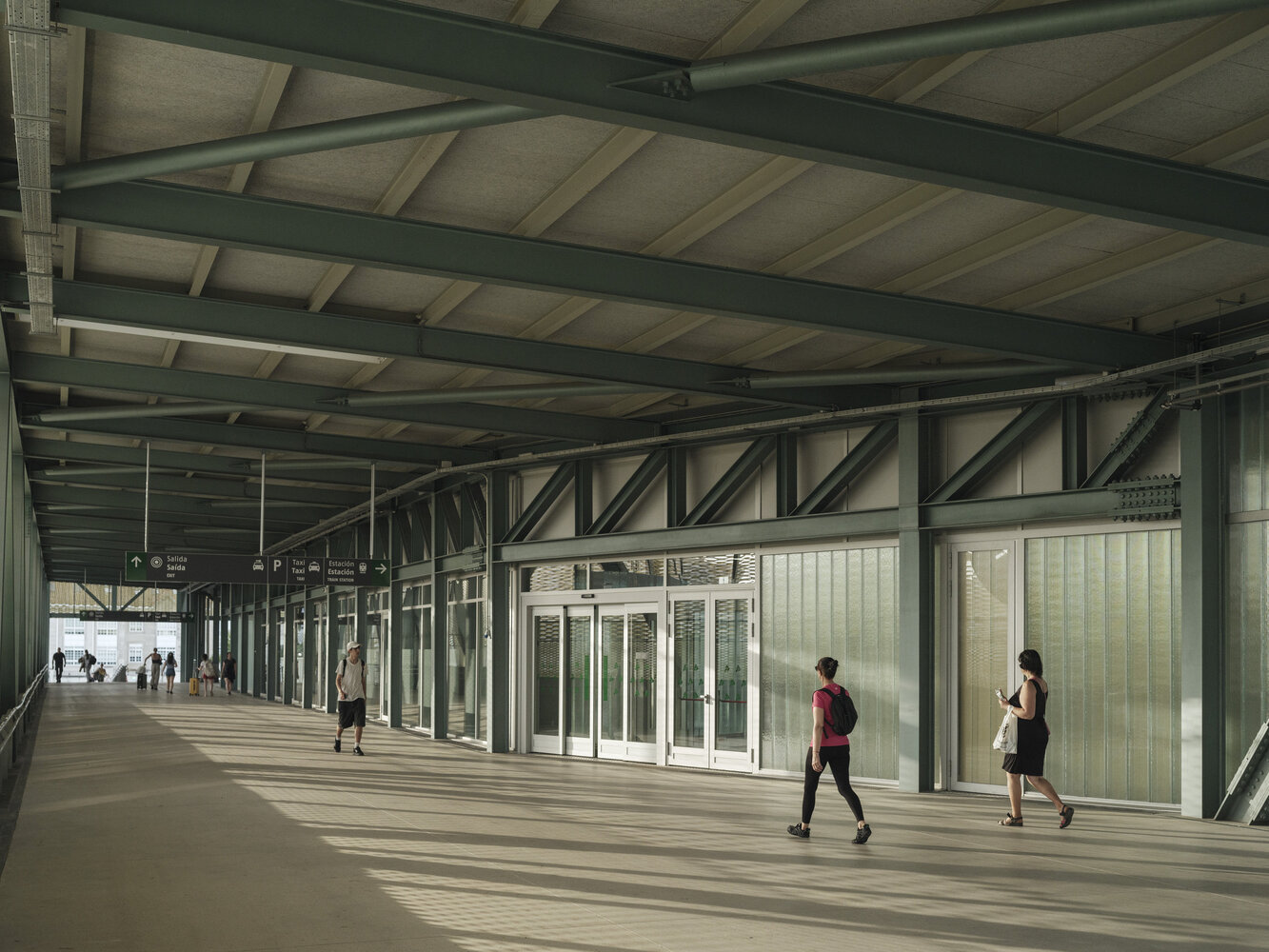 西班牙铁路基础设施管理公司(ADIF)为新建高铁火车站发起国际设计竞赛,最终中标的方案将旅客站房横向布置在站台上方,并与 2011 年启用的大型步行天桥融为一体。这座天桥不仅实现了火车站、汽车站与停车场之间的多式联运衔接,更带来了关键的城市功能价值:它将历史中心及其周边区域与城市南部、萨尔河公园(Parques del Sar)及文化城(Ciudad de la Cultura)连接起来,重新梳理了因陡峭地形与铁路线路而长期分隔的两个区域之间的关系。