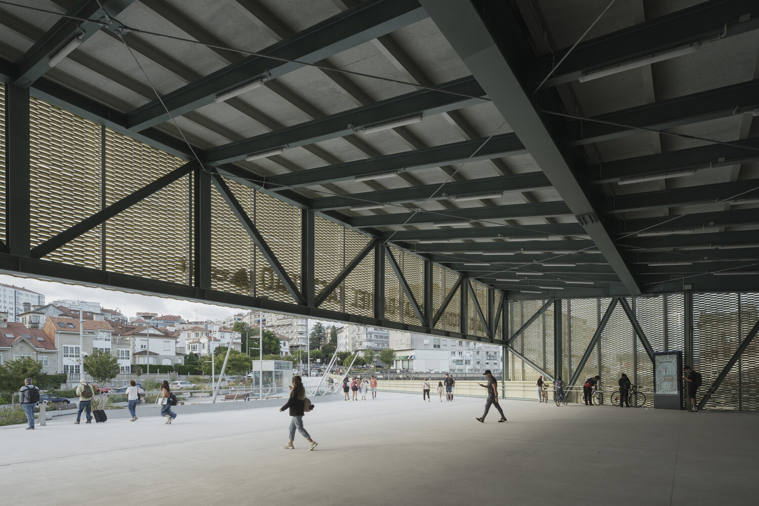 建筑采用有机形态适应场地环境,在整合各项功能的同时,未在构图上做出妥协。施工首先从安装大型预制混凝土柱板平台开始,随后在该平台上采用工业化装配体系建造站房 —— 这种建造方式兼具轻盈性与精准性,能够在铁轨上方施工而不中断铁路运营。建筑外立面融合了多种材料:半透明材料、穿孔金属板以及锌合金屋面(加利西亚地区的锌加工产业在西班牙国内处于领先地位)。室内设计则力求最大化采光效果,大量使用半透明结构玻璃,即便在阴天也能增强自然光的反射,营造出明亮舒适的等候空间。