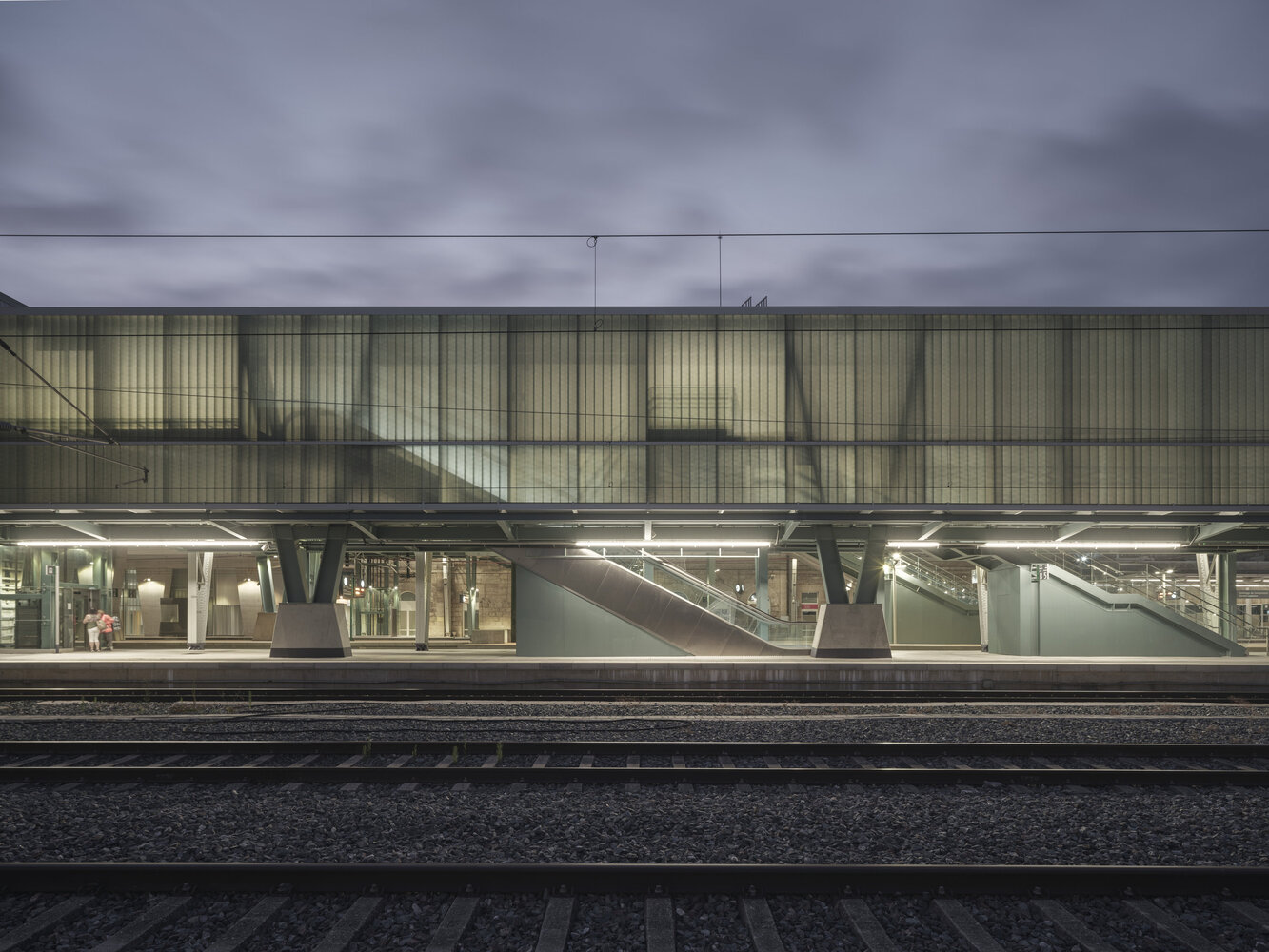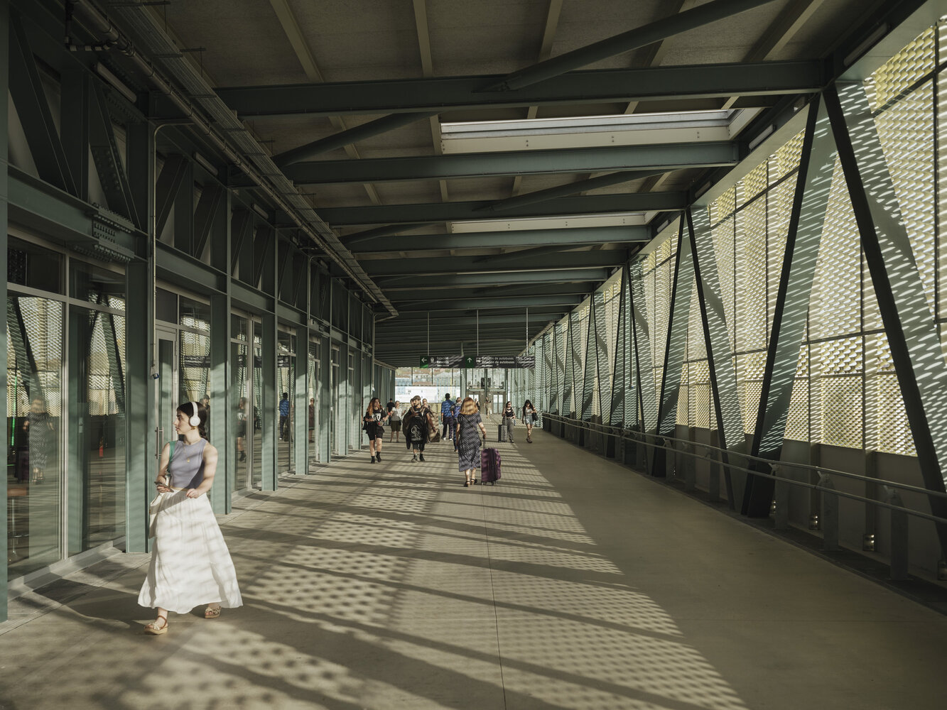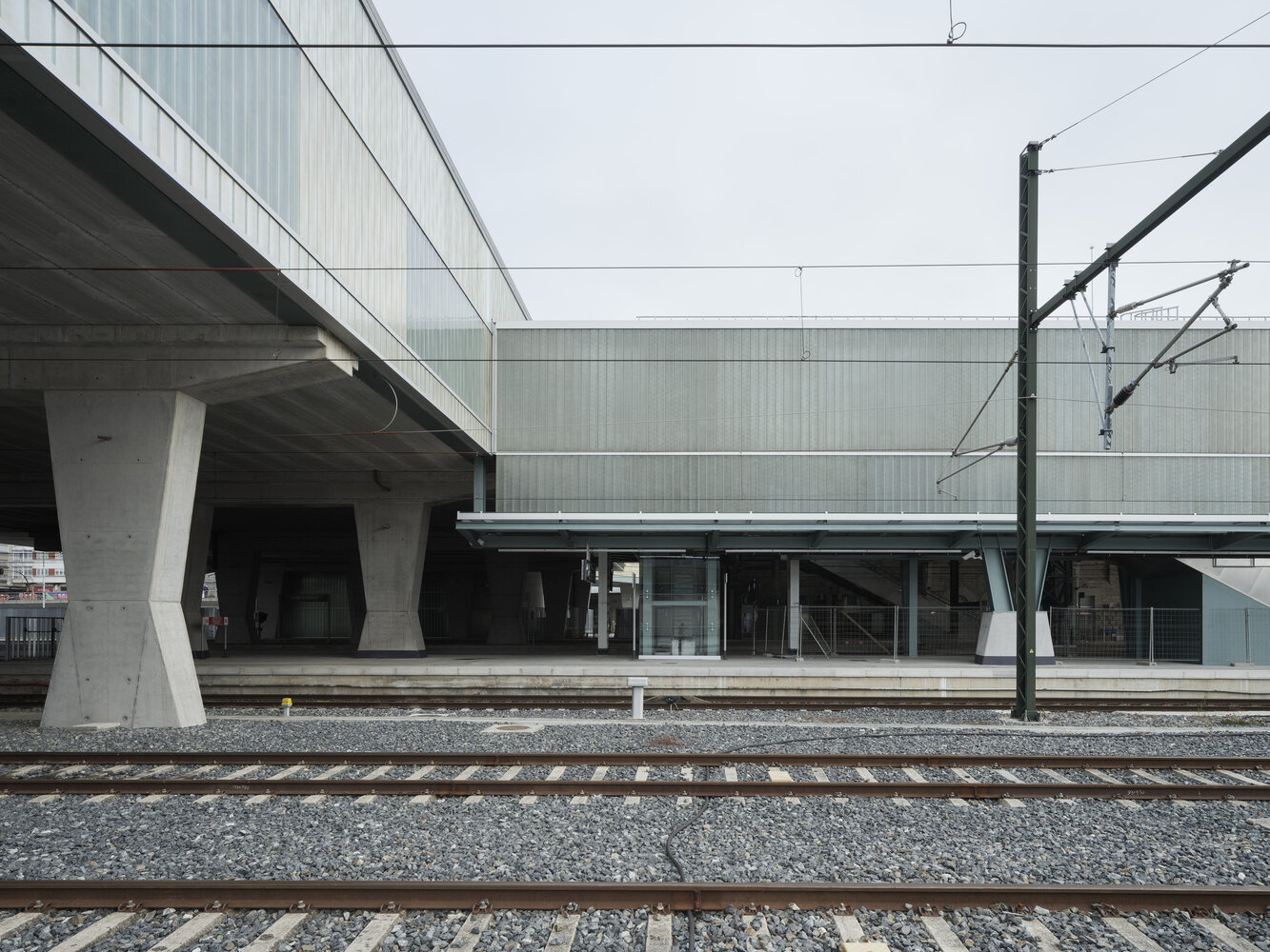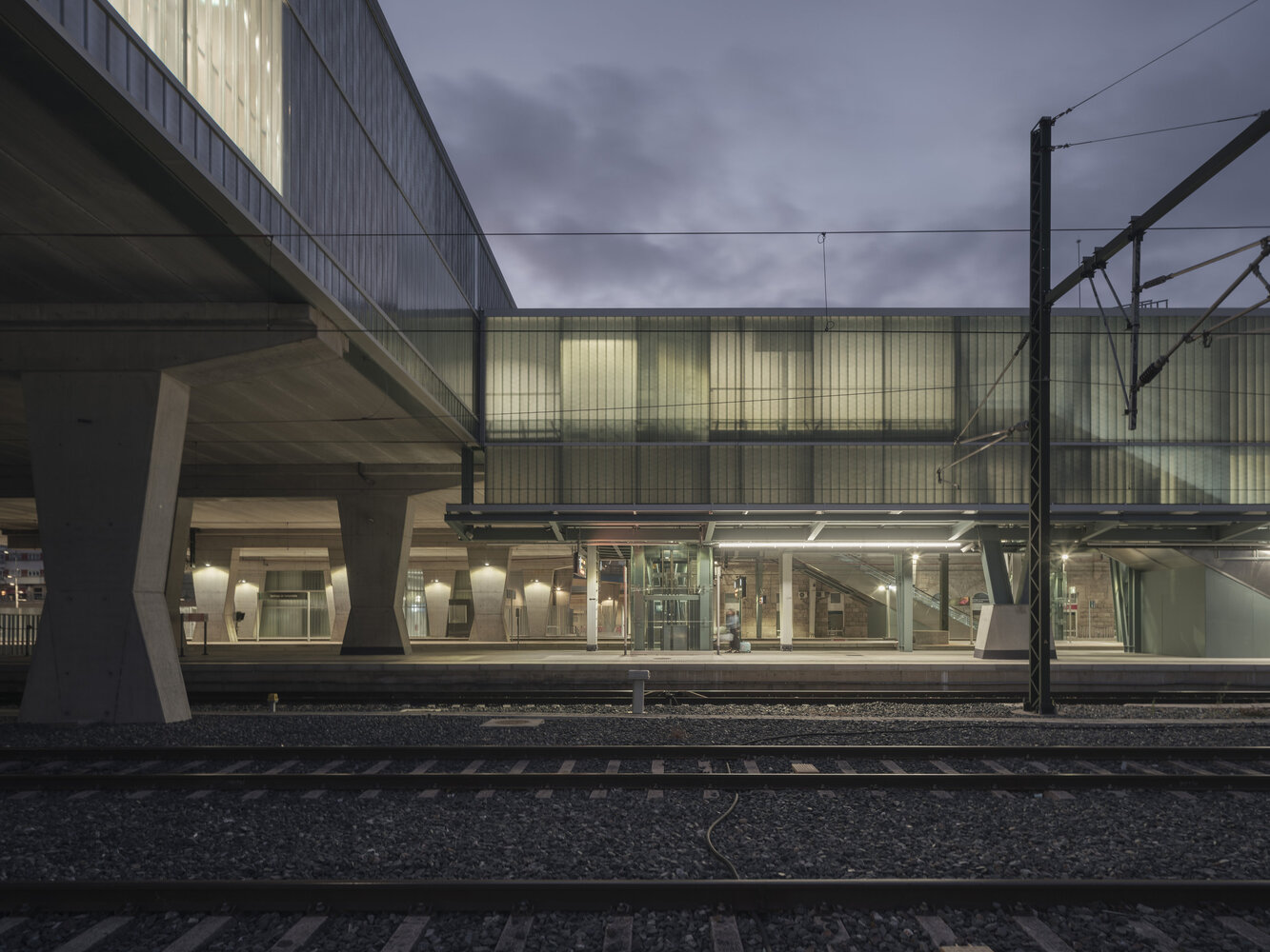 由于大多数铁路旅客选择步行进出车站,该项目的核心设计理念得以强化 —— 将旅客站房与城市地面标高对齐。遵循这一原则,车站采用了典型的机场式布局:下层靠近铁轨,集中了所有机动交通接驳功能,包括出租车、私家车、租赁车辆以及市内和长途公交车;上层与城市交通网络相连,作为站台上方的进出港平台。上层的核心空间是明亮的旅客大厅,旅客可通过一系列天桥直接进入列车,确保通行过程直观、高效且安全。