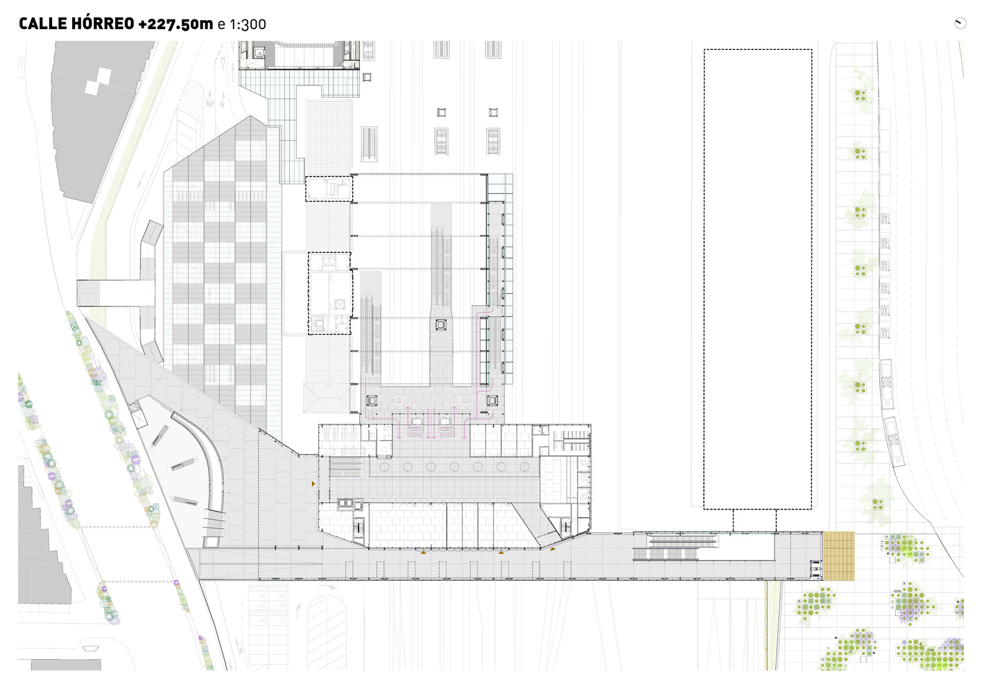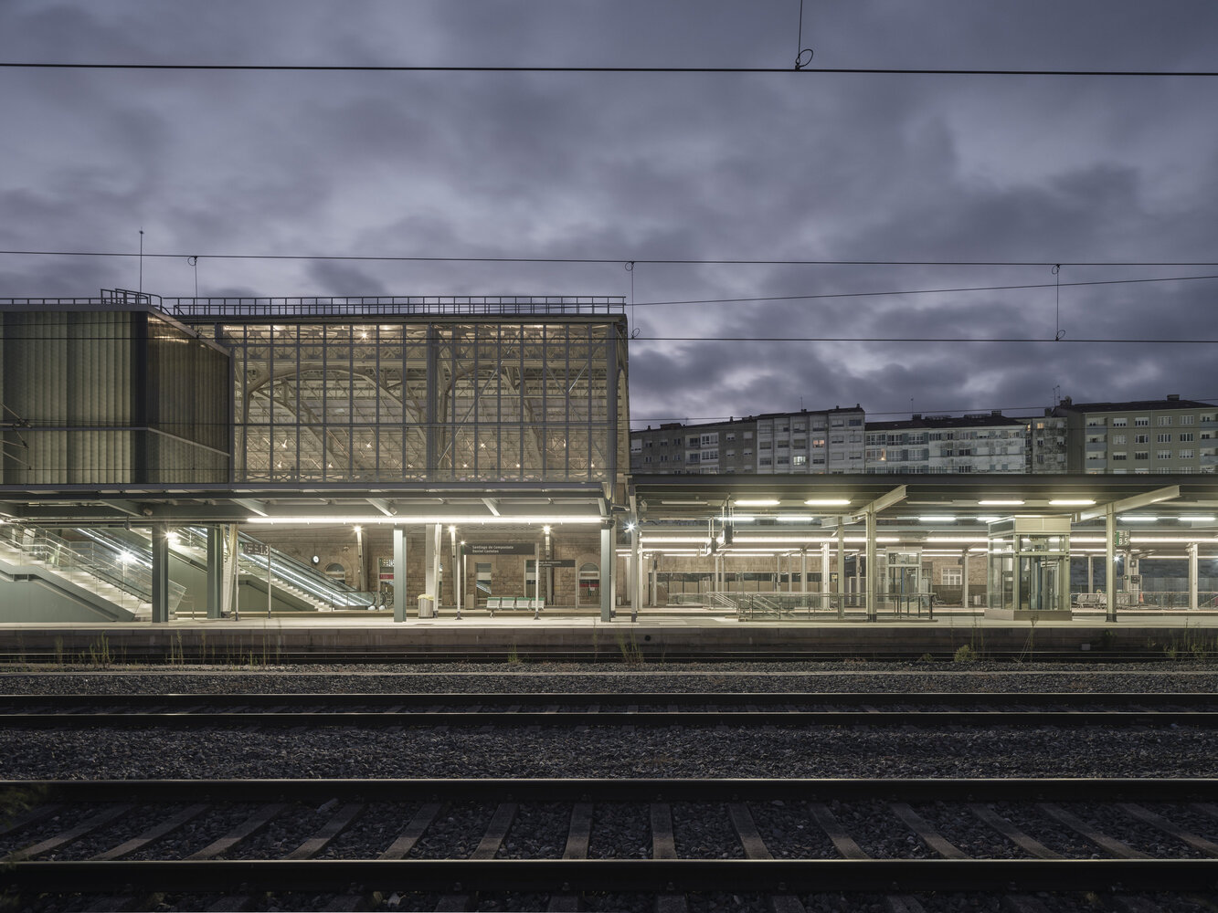 这种简洁的布局与老火车站形成了和谐对话,尤其与老站台上保护旅客活动的宽大雨棚相得益彰。同时,建筑群两端设有两个现代风格的广场 —— 面向城市的车站广场(Plaza de la Estación)和紧邻自然保护区的克拉拉・坎波阿莫尔广场(Plaza Clara Campoamor),它们成为抵达圣地亚哥 – 德孔波斯特拉的旅客首先看到的城市景观。