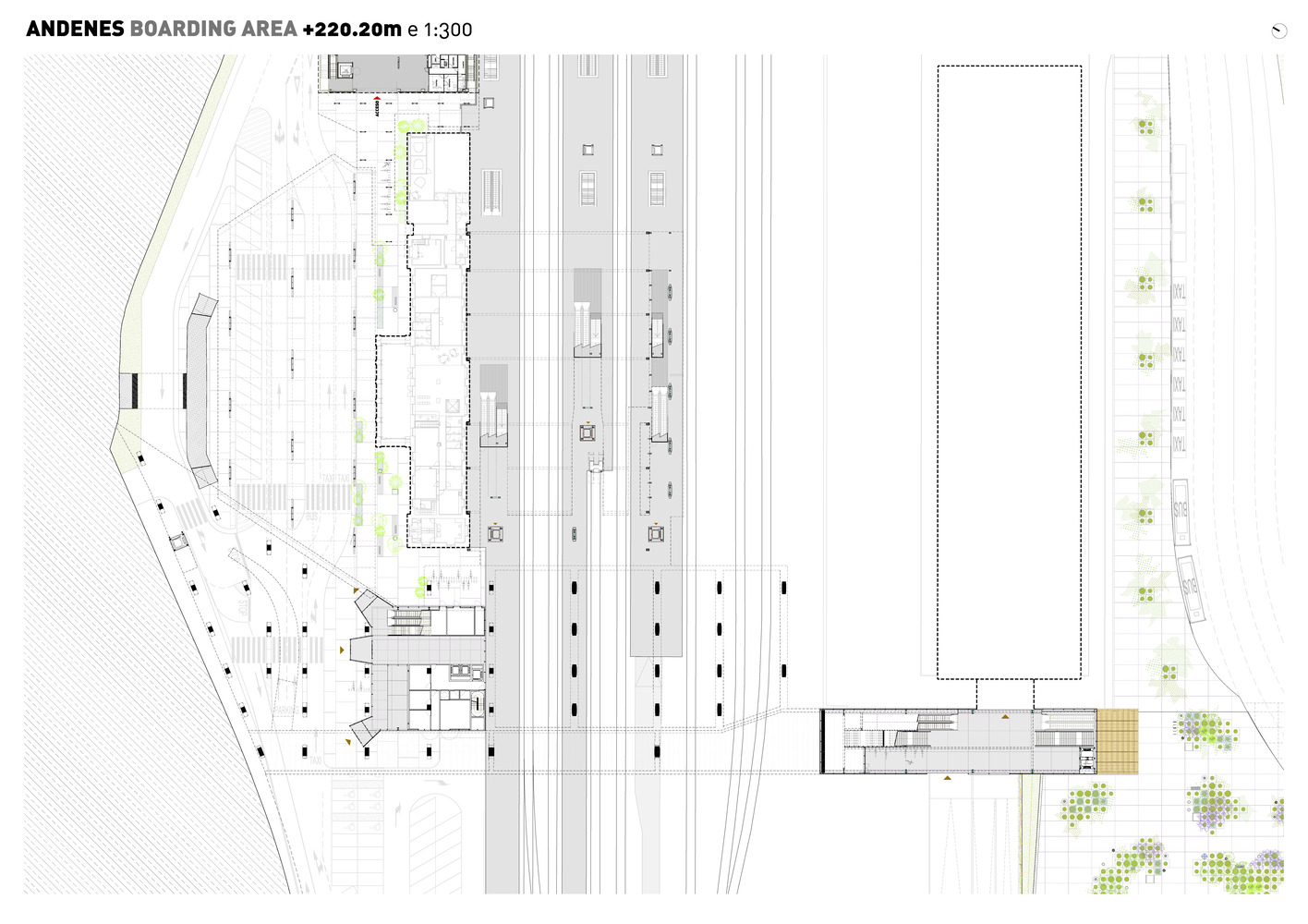 该火车站设计的背景来源于2011 年,在铁路通入圣地亚哥 – 德孔波斯特拉(Santiago de Compostela)70 年后,位于城市郊区的铁路隔离带仍是历史中心与铁路以南新建街区(其中蓬特佩德林哈街区 [Pontepedriña] 为核心)之间一道几乎无法逾越的屏障。与此同时,这道屏障也带来了一个意外收获 —— 它保护了拉斯布拉尼亚斯 – 德尔萨尔(Las Brañas del Sar)自然区域。这片生态价值无可估量的区域,在数十年间始终保持着原始风貌。