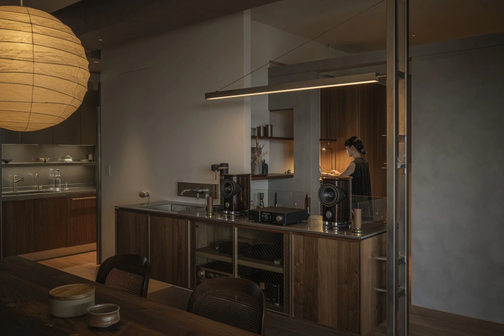 空间的布局藏着对“不同温度”的精准呼应,每一处设计都在适配不同的生活场景。书房被刻意压低了尺度,如同一个静谧的“思考胶囊”嵌入屋内——低矮的吊顶、柔和的局部照明,以及围合式的书桌布局,都在无形中营造出专注的氛围,让人能快速沉下心来,隔绝外界的干扰,投入到工作的深度思考中。与书房的内敛形成鲜明对比的,是家中“重心所在”的大餐桌。它没有被局限在“用餐”的单一功能里,而是成为了这个家的“活力中心”:清晨在这里吃一份早餐开启新的一天,午后铺开纸笔写写画画,傍晚和家人围坐聊天分享日常,周末邀请朋友来此小聚,甚至在工作疲惫时,在这里泡一杯茶听会儿音乐——餐桌的宽大尺度,包容了生活的多元场景,让亲密的余温在此不断累积。而那座以铁件结构打造的音响柜,无疑是这个家的灵魂。铁件的冷硬质感与木材的温润形成对比,本身就是空间美学的一部分;更重要的是,它流淌出的声音为空间注入了时间的质地——工作时,轻柔的古典乐让人保持专注;闲暇时,舒缓的民谣让身心放松;聚会时,欢快的旋律点燃氛围。声音让日常被听见,也让不同场景的温度更加鲜明。