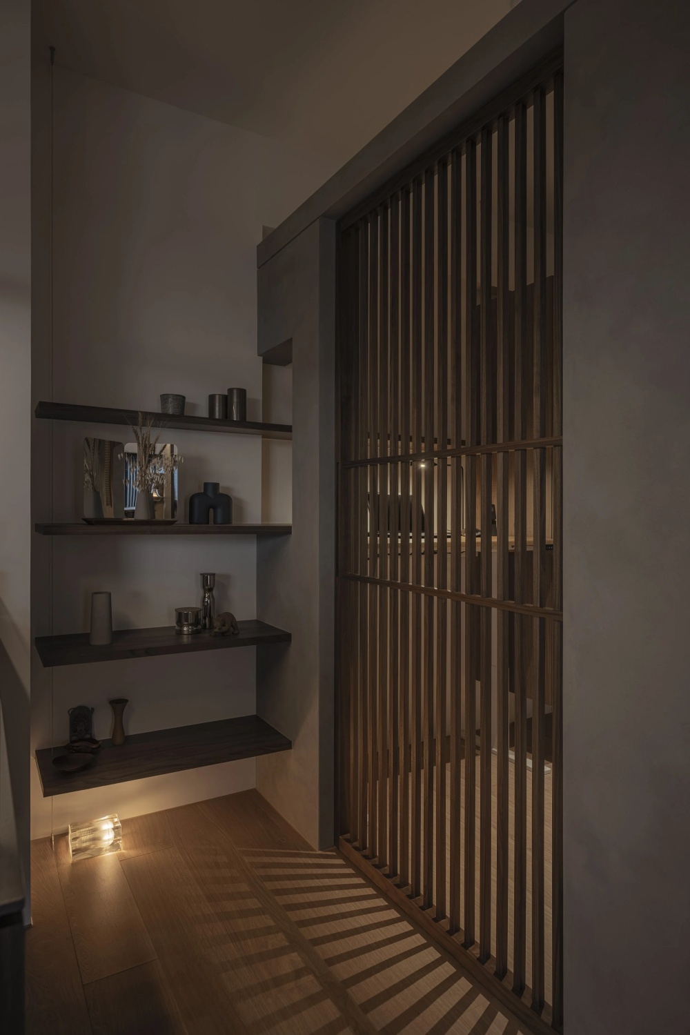 打破“墙”的阻隔,隔间柜体成为了这个家的核心轴心。它没有生硬地划分区域,而是以“可被行走的中介”姿态,串联起整个空间的脉络。柜体上的两个开口如同精心设计的呼吸口,将主卧、客厅与多功能房串联成一条流畅的回字动线。当人在这条动线上移动,空间便随之产生延展的韵律——从主卧的私密休憩,到客厅的放松交流,再到多功能房的专注工作,无需跨越冰冷的隔断,只需几步流转,就能完成状态的自然过渡。这组柜体既是收纳的载体,更是空间的“节奏控制器”。它为工作预留了专属的储物区域,文件、设备被妥善安放,不打扰生活的温馨;同时又以开放的格架展示着家人的照片、旅行的纪念品,让生活的气息渗透到每一个角落。生活与工作的界线,在此化为可被呼吸的节奏,不再是泾渭分明的分割,而是相互渗透的融合。.+