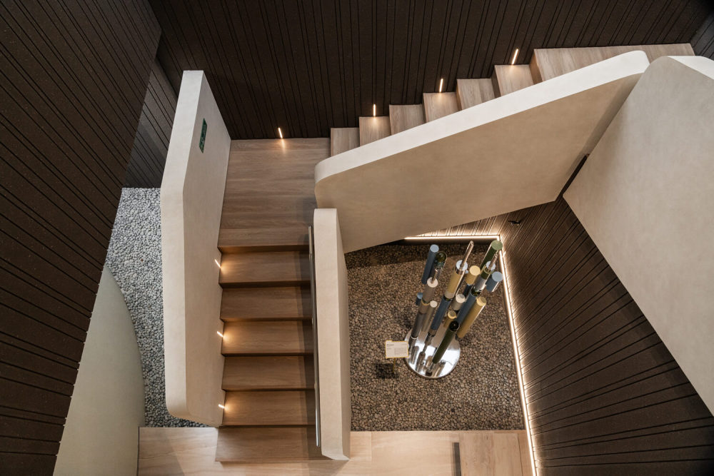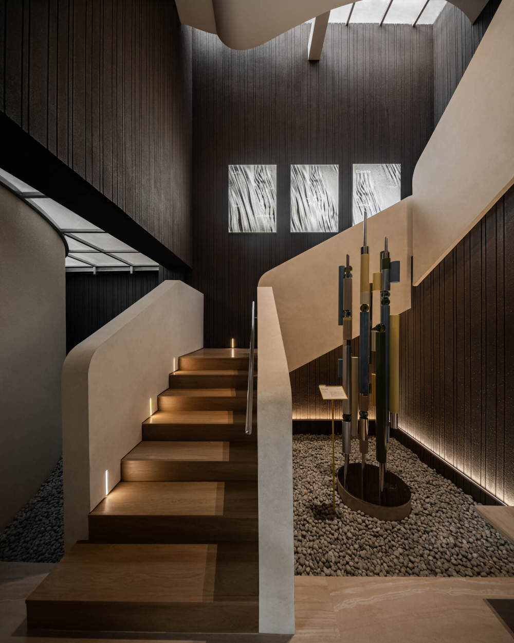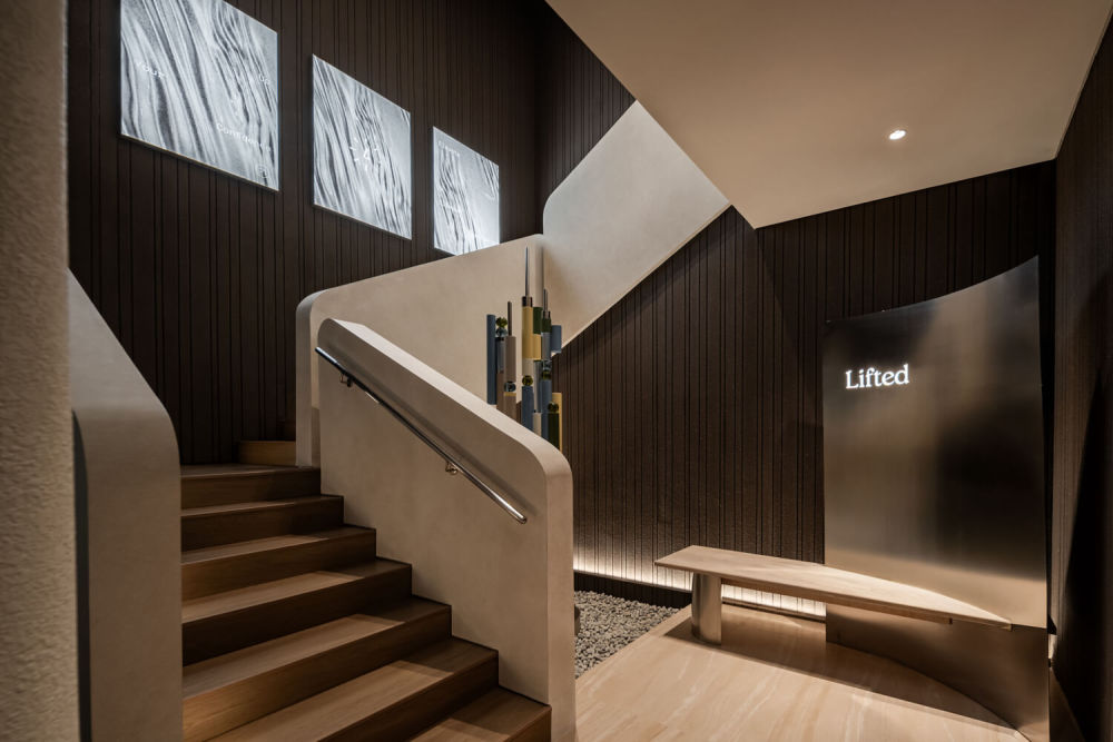 Lifted在医疗保健的无菌性和健康的柔软性之间取得了平衡,激发了Helen Agustine工作室在科学清晰度和艺术表达之间创造空间对话,将艺术和科学融合成一种有凝聚力的空间体验。该设计平衡了功能、品牌、舒适性和卫生性,同时保持了强烈的信任感、奢华感和专业性。这是通过将温暖的有机纹理与不锈钢和玻璃等临床元素并置的材料选择实现的。布局的中心是一个高效的环形走廊,周围环绕着咨询和治疗室,在狭小的建筑面积内最大限度地利用空间。参观者通过一个动态的、流动的楼梯进入诊所,楼梯通向二楼,旁边是加布里埃尔·白羊座的特定场所装置——一个灵感来自注射器形状的抽象三维雕塑。