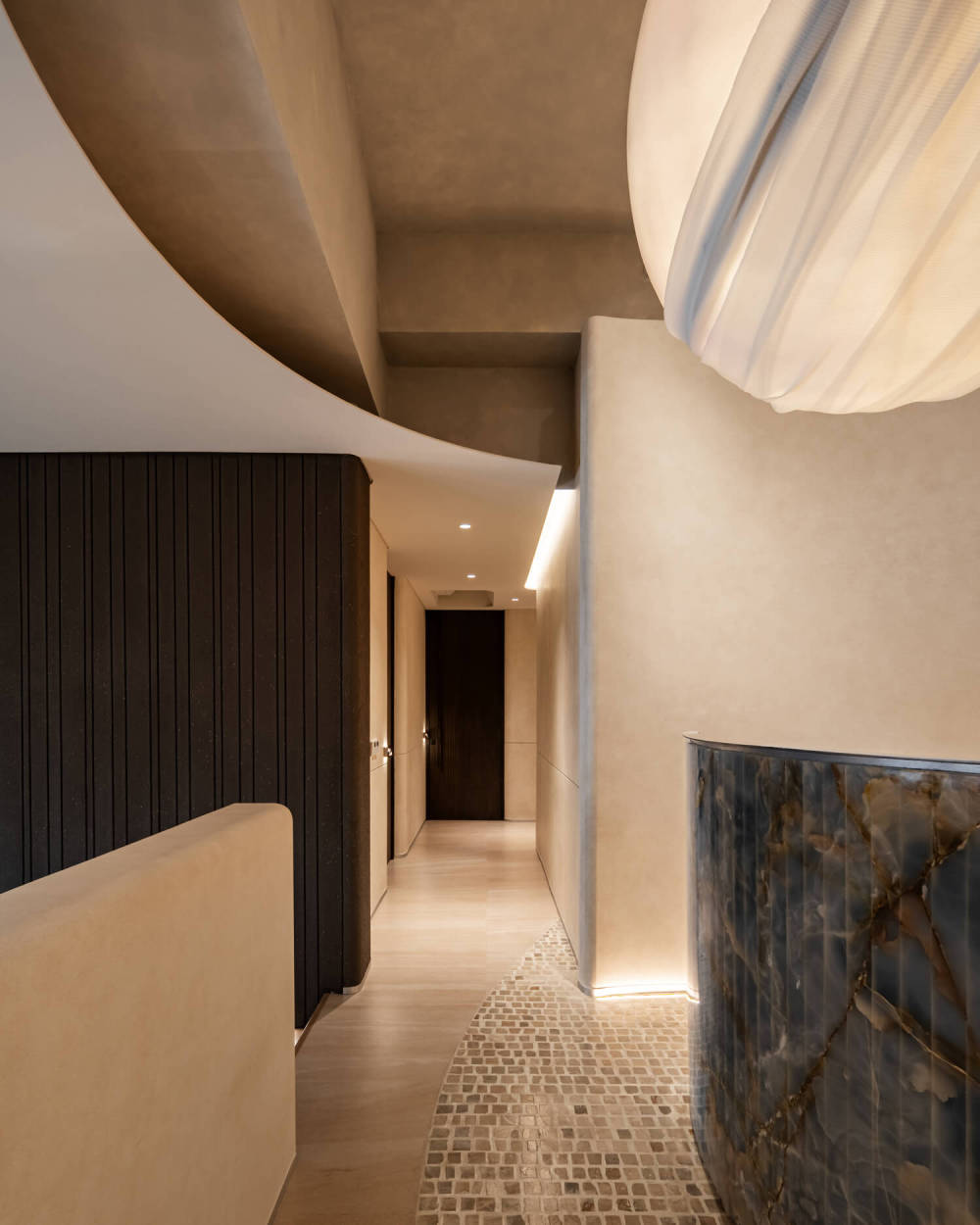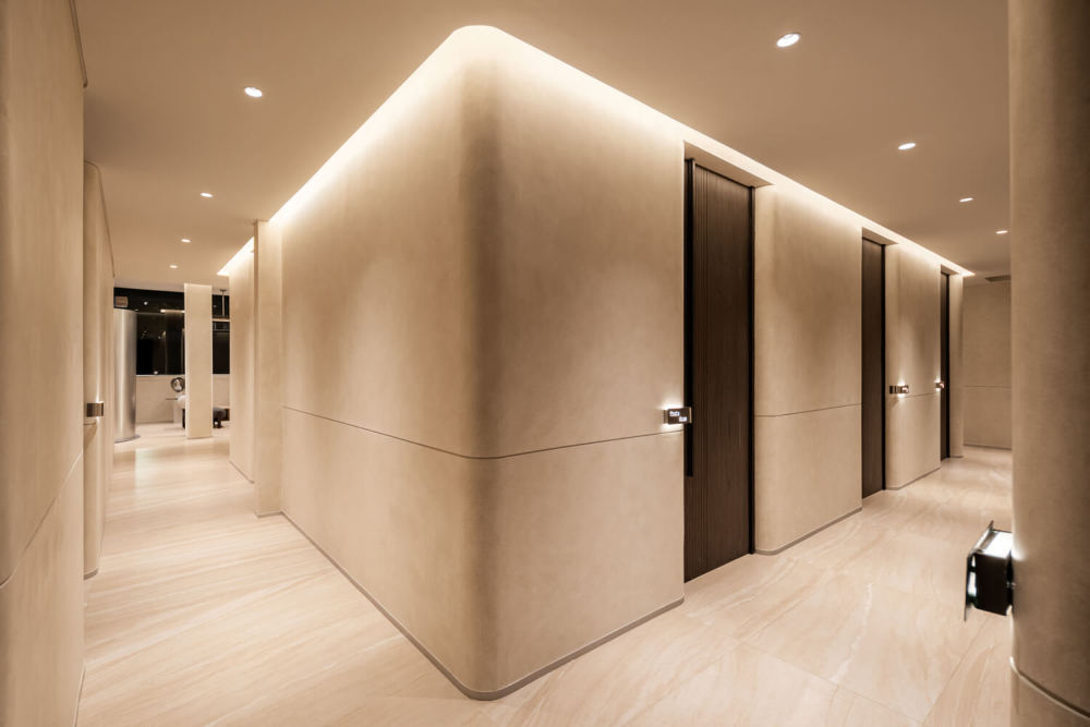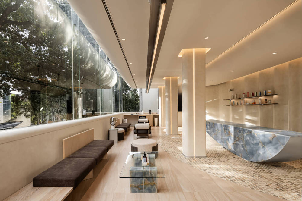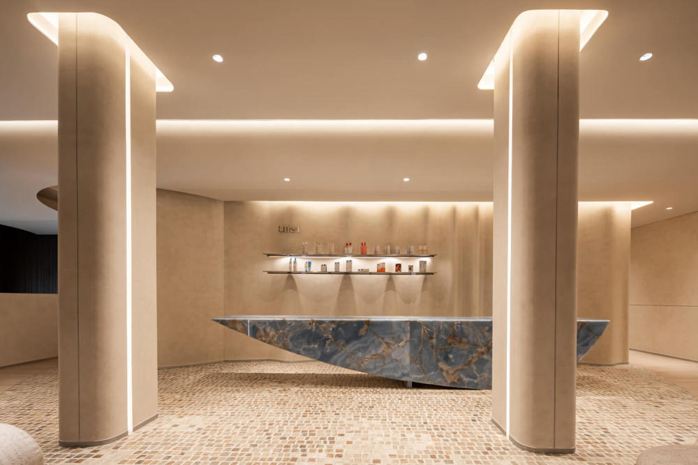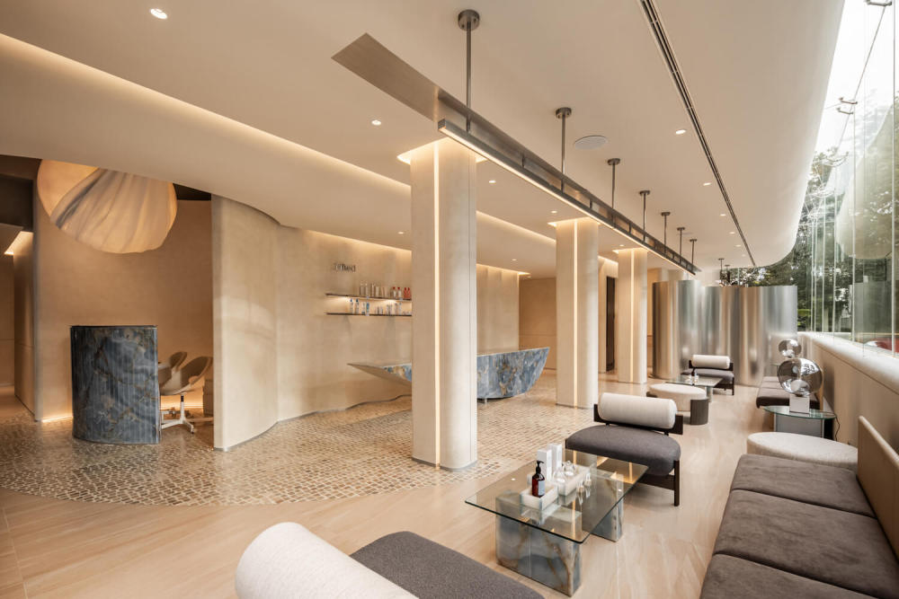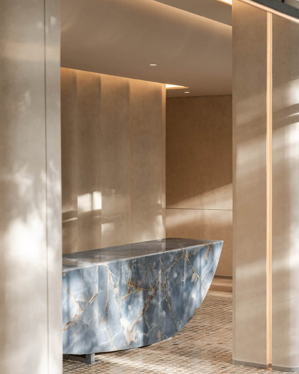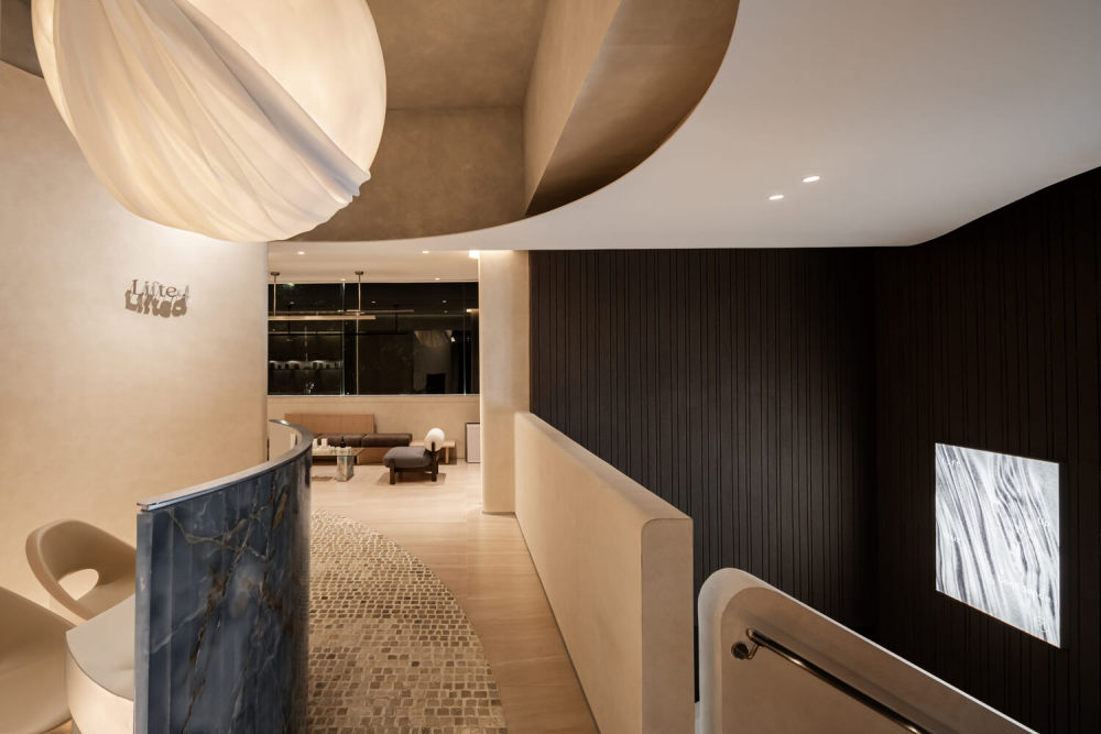 室内设计本身通过家具细节和整体空间构成中的众多浮动和高架元素,呼应了诊所的名字“Lifted”。立面向外悬挑着长长的无缝玻璃面板,营造出两种漂浮形式的错觉:弯曲的墙壁和拱形的大厅天花板。大厅内部设计为精品休息室,配有低矮舒适的座位,以缓解患者的焦虑。一张雕塑般的蓝色大理石桌子似乎以不对称的曲线从地板上漂浮下来,兼作产品展示和等候区,由波纹状的墙壁纹理构成,参考了人体皮肤的层次。接待处由同一块大理石固定在一个发光的球体和一个裸露的混凝土圆形天花板下。