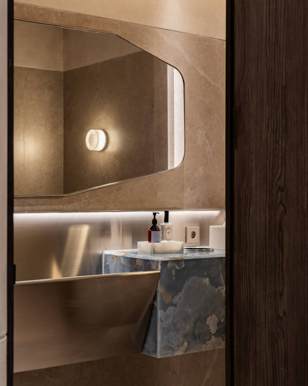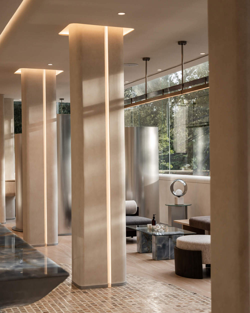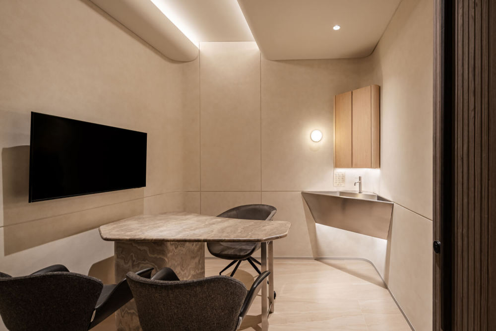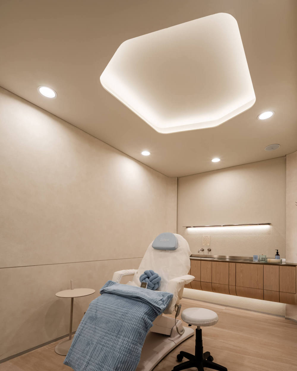 天窗和加长玻璃窗允许日光照射到最小的区域,包括入口和治疗室,使它们感觉开放和通风。弯曲的建筑细节贯穿每一面墙、每一根柱子和每一件家具,软化了空间体验,并有意对抗通常与注射器和注射相关的尖锐临床图像。Lifted重新定义了美容诊所的类型学,通过温和地重新构建围绕美容治疗的叙事和污名,体现了艺术性和专业性,通过设计培养了一种心理舒适感。
