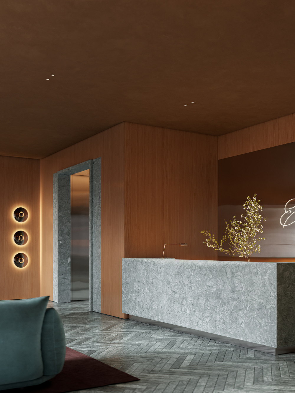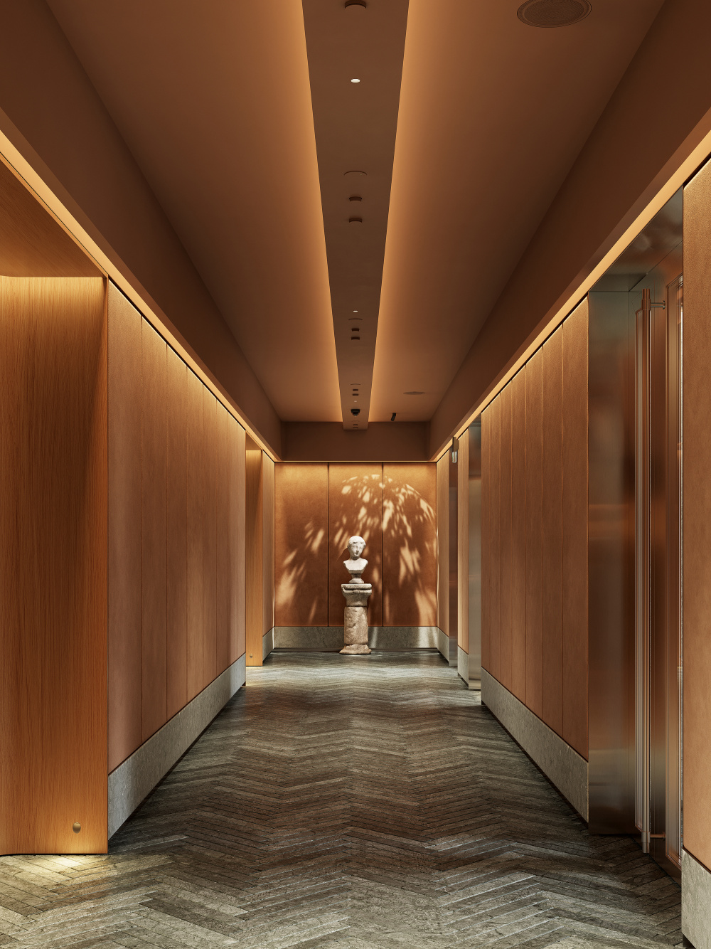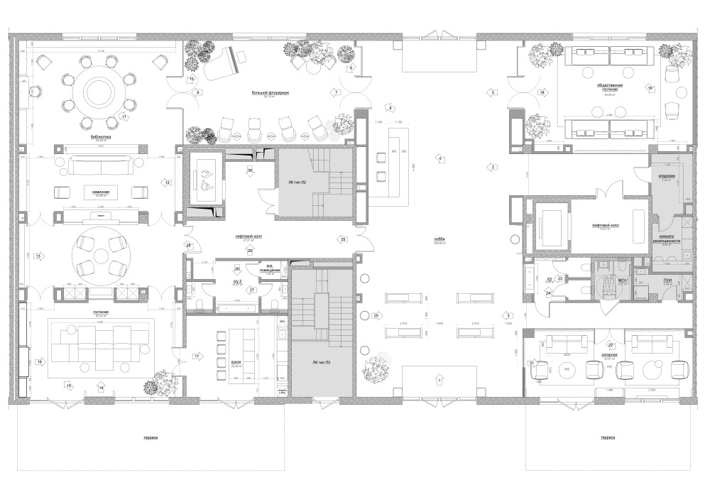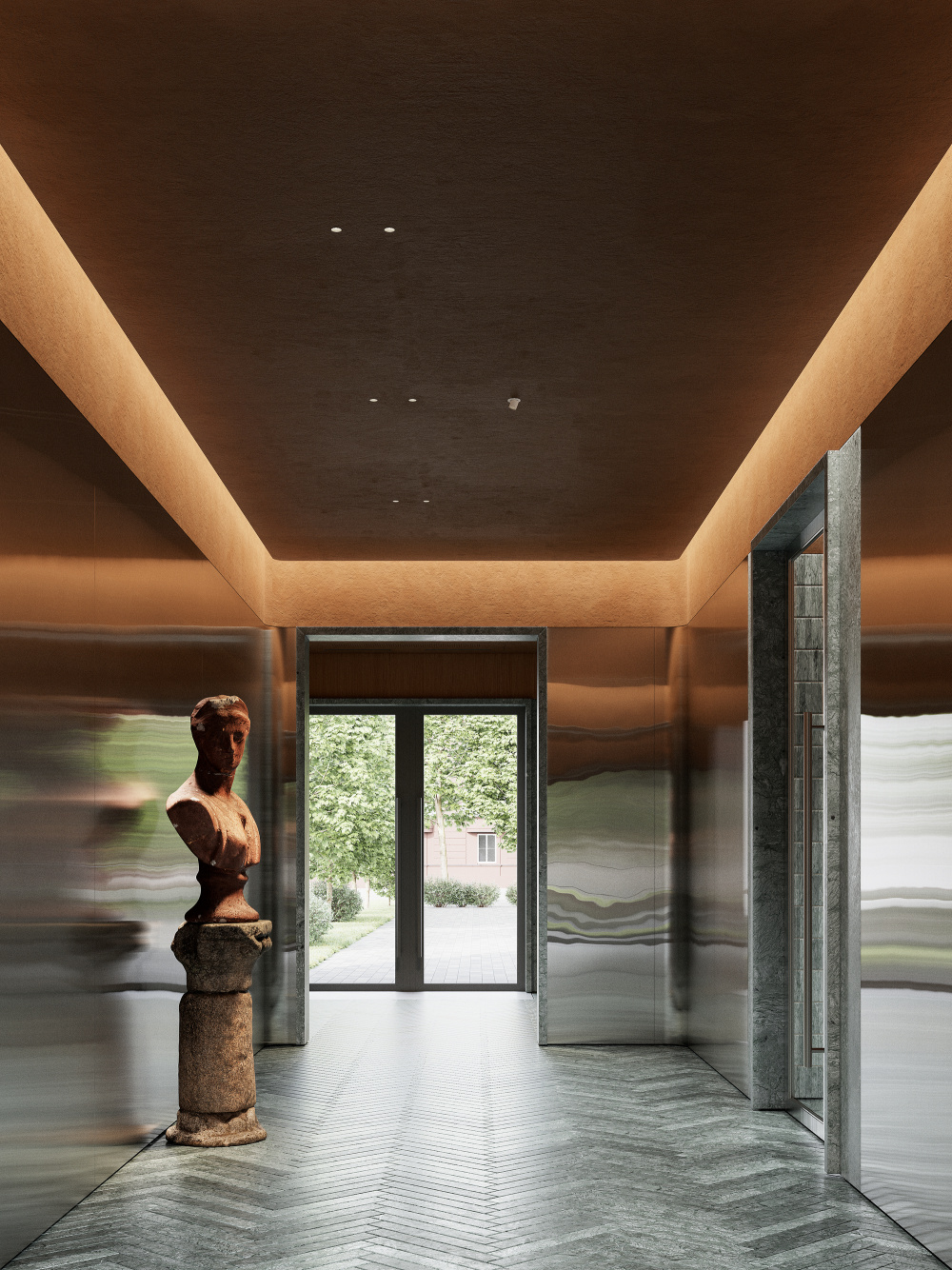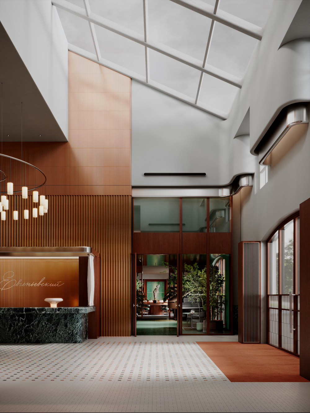项目的设计精髓,在于对圣彼得堡古典建筑主题的 “现代性重思”。团队并未陷入风格化的模仿或对历史元素的直接引用,而是提取了古典建筑中最具代表性的形式、对称性,以及圣彼得堡历史建筑固有的经典元素,通过现代设计的棱镜进行重构与演绎。在空间布局上,古典建筑的对称美学被赋予新的表达:大厅的核心轴线依旧是视觉与功能的主导,但两侧的功能区却以非对称的灵活布局打破沉闷,既保留了古典空间的秩序感,又契合了现代生活的多元需求。在形式塑造上,古典建筑的柱式、拱券等元素被简化提炼,以金属、玻璃、石材等现代材料重新呈现 —— 比如简化的拱券轮廓以金属线条勾勒于墙面,既呼应了圣彼得堡的建筑文脉,又以简洁的线条融入当代审美。这种设计手法,让古典的韵味不再是沉重的历史符号,而是化作空间中流动的气质,与现代技术、概念设计无缝融合。