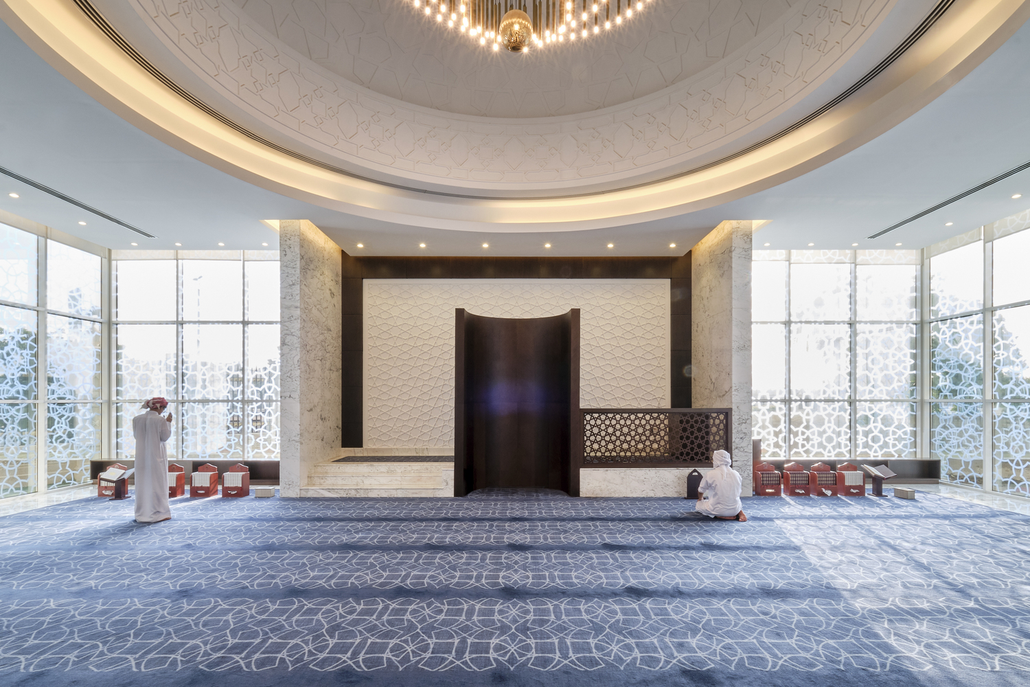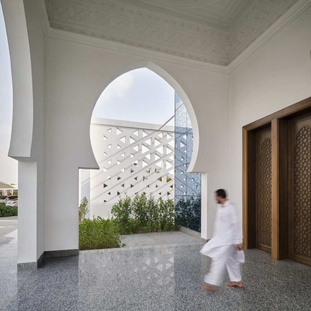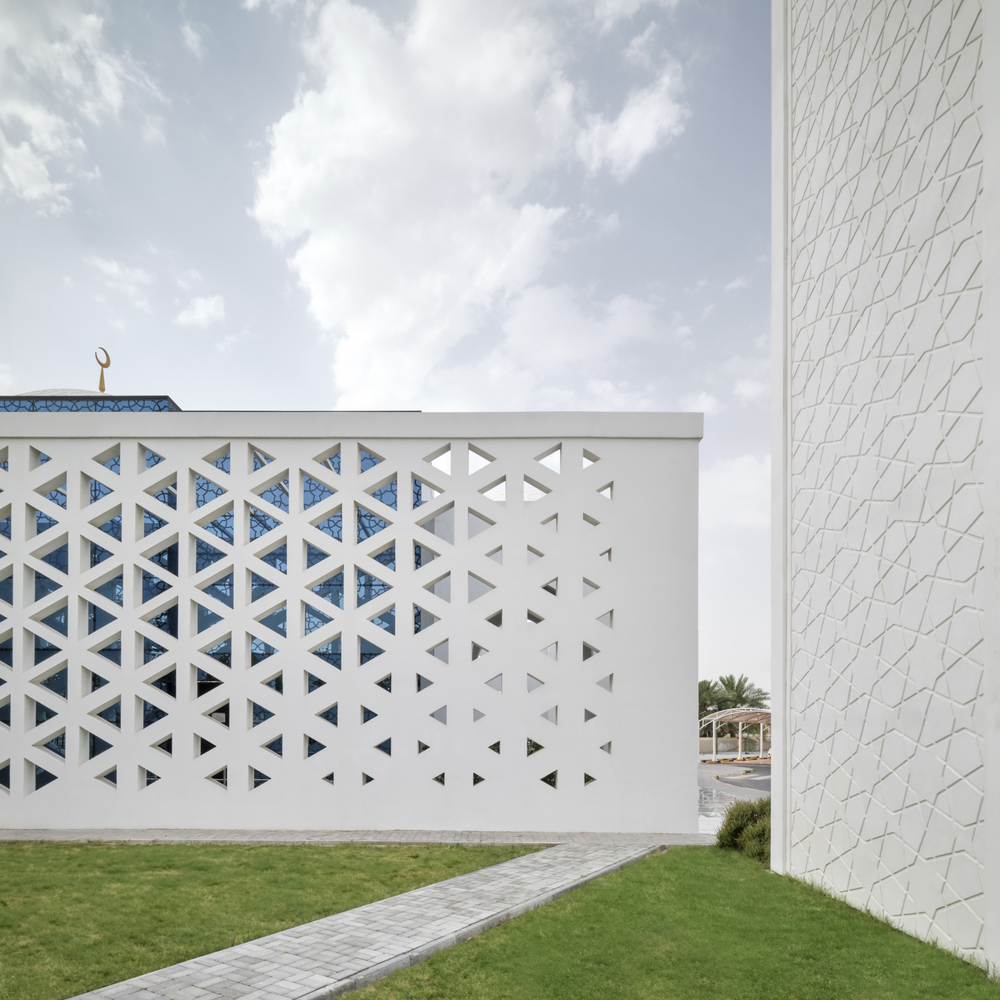 清真寺的建筑语言由精确的几何图形和装饰细节构成。外墙上环环相扣的几何图案是伊斯兰哲学的关键原则–统一与和谐的视觉代表。穹顶是清真寺建筑中的一个传统元素,但在重新诠释时却加入了现代元素,采用了极简主义设计,既保持了宏伟感,又不失整体美感。设计中实体与虚空的并置创造了视觉趣味,让自然光渗透到内部,增强了朝拜者的精神体验。