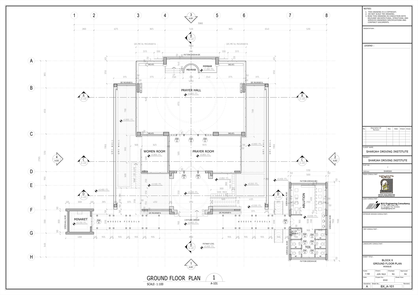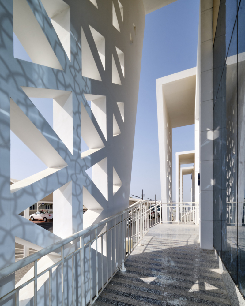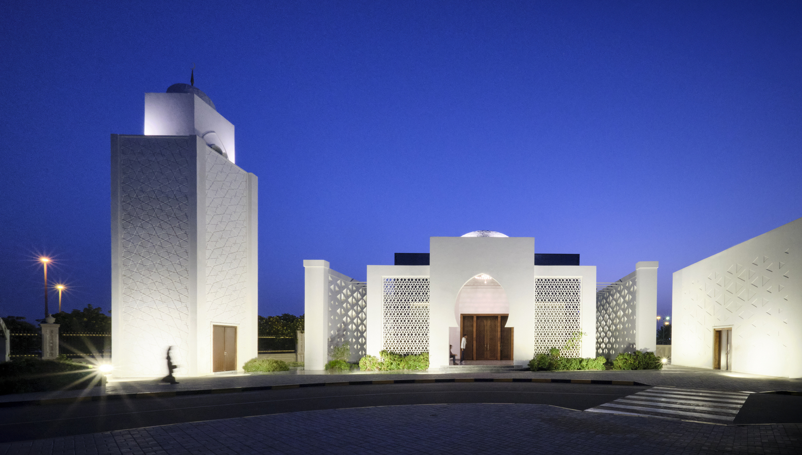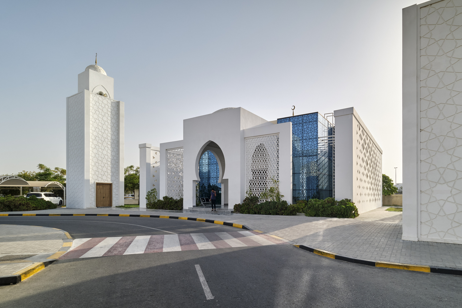 MJU 工程咨询公司为沙迦驾驶学院设计的清真寺体现了现代建筑语言与传统伊斯兰图案的和谐统一,既体现了文化意义,又具有现代功能。设计从丰富的伊斯兰建筑历史中汲取灵感,其特点是复杂的几何形状和光线的运用。建筑立面采用精致的 “mashrabiya ”屏风,可以过滤阳光,在室内空间营造出光影交错的动态效果。这不仅增强了精神氛围,还通过减少热量增加提高了能源效率。