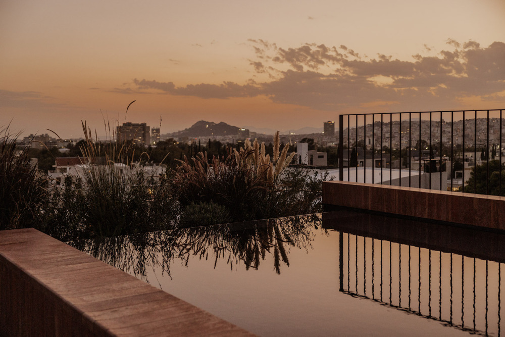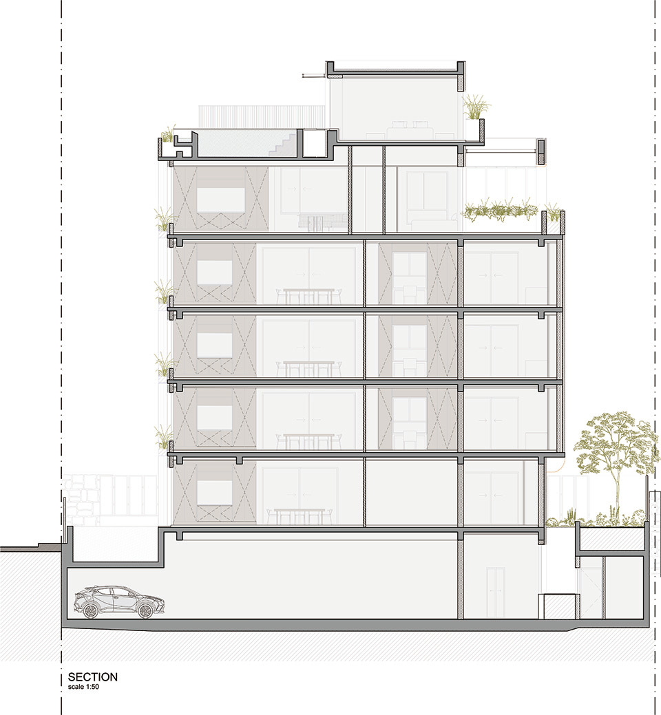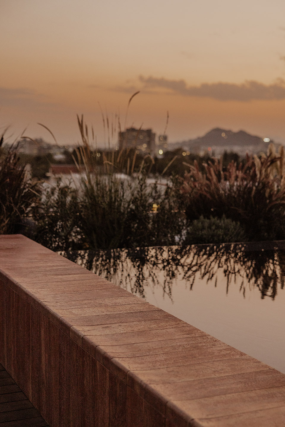 Papagou 区作为雅典的经典片区,留存着 20 世纪国际风格的建筑印记,这成为 Block722 设计建筑外观的重要灵感。这栋新建住宅楼以几何明晰的形态致敬区域的 “黄金年代”,却又用柔和的曲线、温润的木质细节与繁茂的地中海植物,消解了现代主义的冷峻。建筑朝南背靠树林,街角的地块优势让自然绿意与城市景观得以双向渗透,而 Block722 将顶层两层留作自用,也为打造 “空中独栋住宅” 埋下伏笔。与本地承包商 Thekla Construction 的合作,让这栋包含五套住宅的精品建筑,既保持了开发的专业性,又融入了工作室对家的独特理解。从建筑外立面的材质选择,到窗洞的比例设计,每一处都在平衡 “地域记忆” 与 “当代需求”—— 石材的硬朗呼应着雅典的城市肌理,木质格栅的轻盈则适配着地中海的阳光,让建筑在 Papagou 区的街道上,成为既熟悉又新鲜的存在。