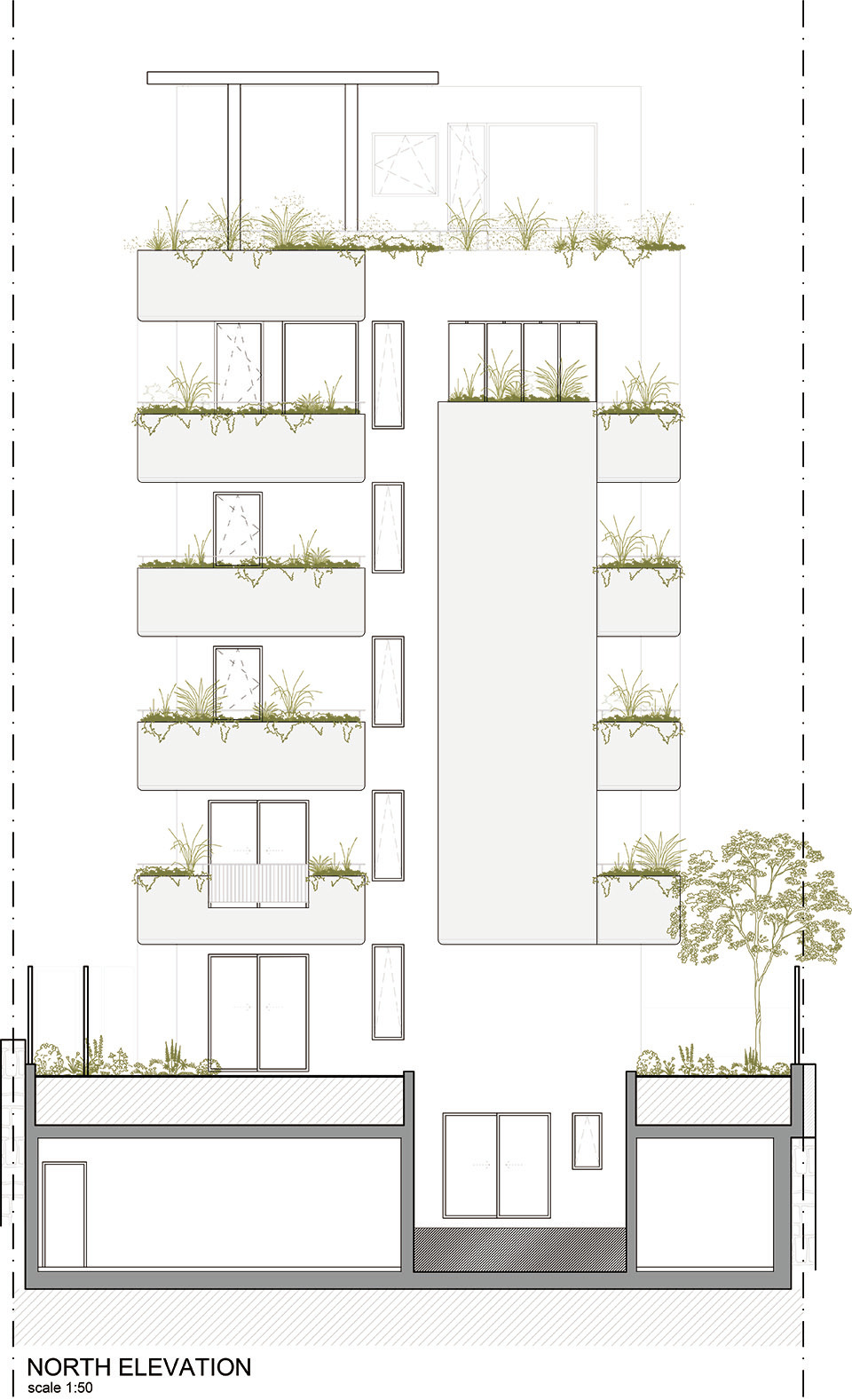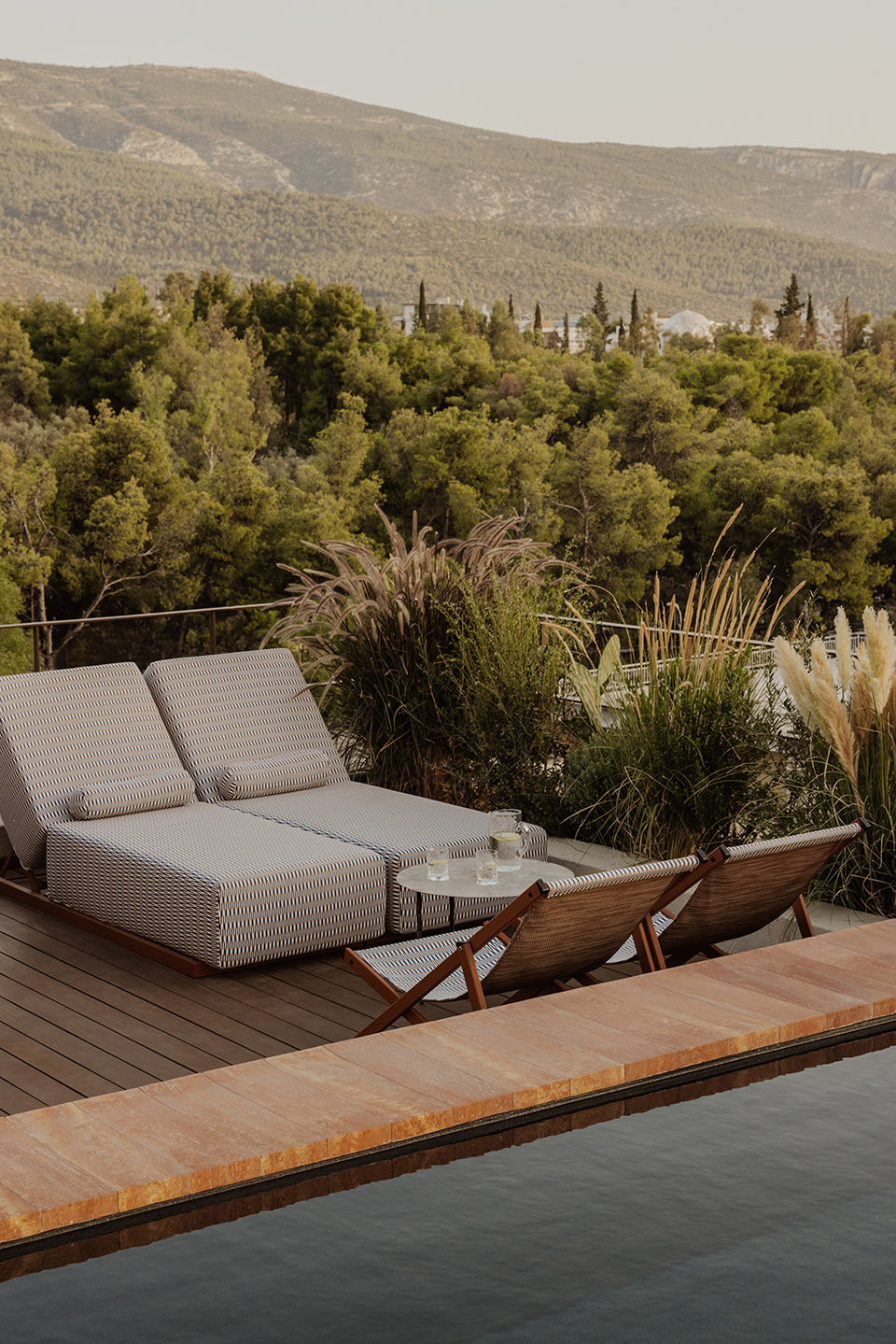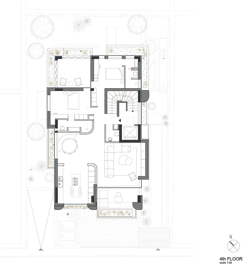 Papagou 区作为雅典的经典片区,留存着 20 世纪国际风格的建筑印记,这成为 Block722 设计建筑外观的重要灵感。这栋新建住宅楼以几何明晰的形态致敬区域的 “黄金年代”,却又用柔和的曲线、温润的木质细节与繁茂的地中海植物,消解了现代主义的冷峻。建筑朝南背靠树林,街角的地块优势让自然绿意与城市景观得以双向渗透,而 Block722 将顶层两层留作自用,也为打造 “空中独栋住宅” 埋下伏笔。与本地承包商 Thekla Construction 的合作,让这栋包含五套住宅的精品建筑,既保持了开发的专业性,又融入了工作室对家的独特理解。从建筑外立面的材质选择,到窗洞的比例设计,每一处都在平衡 “地域记忆” 与 “当代需求”—— 石材的硬朗呼应着雅典的城市肌理,木质格栅的轻盈则适配着地中海的阳光,让建筑在 Papagou 区的街道上,成为既熟悉又新鲜的存在。