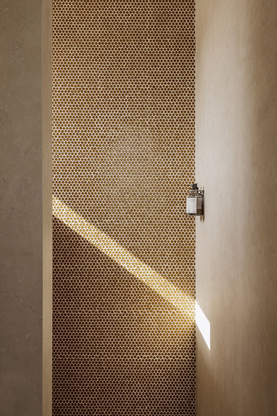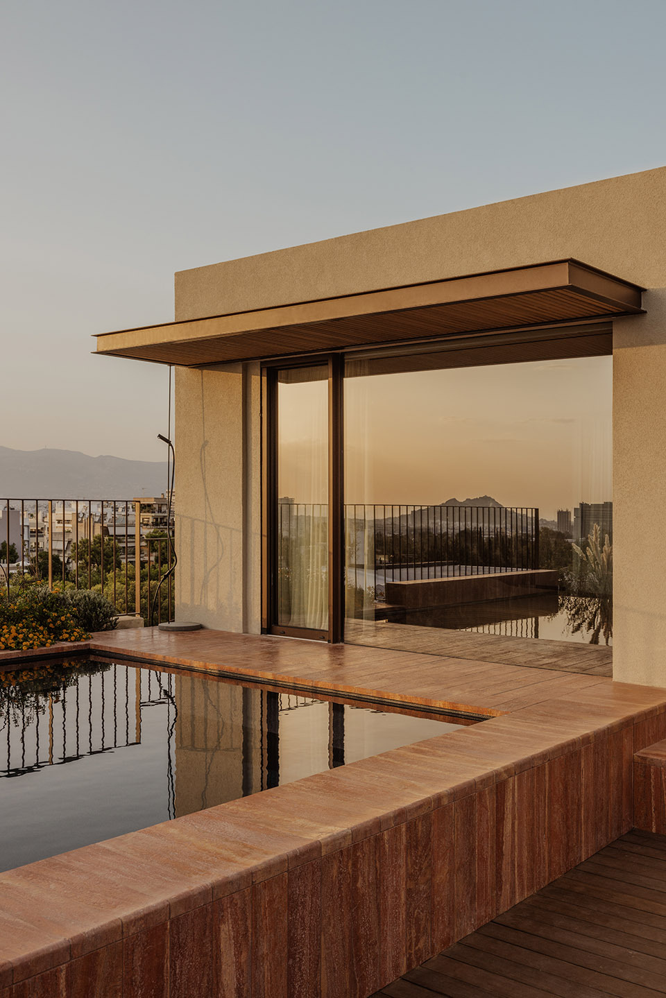“健康与亲自然” 是贯穿设计的核心线索,而自然触感的材料,则成为这份理念最直观的表达。大理石的冷冽、木材的温润、红洞石的肌理、陶瓷砖的质朴,再加上油处理的木地板,不同材质的触感与色彩在空间中交织,形成富有层次的感官体验。这些材料均选自希腊本地,既降低了运输的生态足迹,又让雅典的地域特质融入家的肌理 —— 大理石的纹理呼应着雅典卫城的石材美学,红洞石的暖调则适配着地中海的阳光氛围。大面积的开窗是连接室内外的关键。每个房间都以窗为 “画框”,将 Papagou 区的绿意与城市景观引入室内;自然光随着日照轨迹在空间中流动,让生活节奏与自然的昼夜节律保持同步。屋顶露台的设计更是将 “亲自然” 推向极致:泳池的水色与天空相映,绿植的繁茂与远处的树林连成一片,篮球场上的欢笑与地中海的微风相融,让高层公寓的生活,拥有了独栋住宅的自然体验。