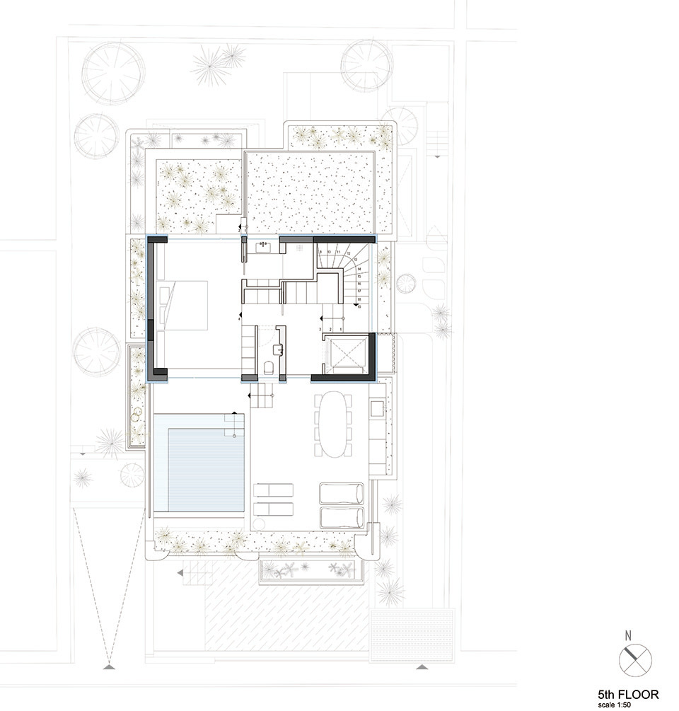 对 Block722 而言,这所公寓绝非简单的设计作品,而是为四口之家量身定制的生活载体。230 平方米的复式空间被划分为上下两层:下层是开放式的生活核心区,大厨房、流动的客餐厅通过家具与轻质隔断自然划分功能,既满足家庭日常的互动,又能承接宾客来访的社交需求;两个卧室则藏于一侧,保障了私密感。上层的主卧套房独占一层,直通屋顶露台,泳池、休闲平台与半场篮球场的设置,让这里成为家庭的 “空中绿洲”。为了让空间 “如手套般契合” 生活,Margaritoglou 与 Tsergas 带领团队进行了无数次生活情景推演:孩子的玩耍动线、夫妻的工作需求、家庭的聚餐场景,都成为布局设计的依据。工作室自行设计的大部分家具,或嵌入墙体节省空间,或灵活移动适配不同场景;艺术品的摆放、手工装饰的位置,也都与家庭成员的审美与习惯相呼应。这种 “从生活出发” 的定制化设计,让空间没有一丝多余的装饰,却处处透着 “为我而造” 的贴心。